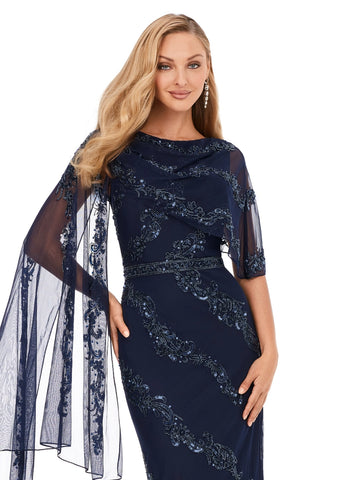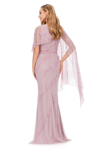 This stunning evening gown is complete with an intricate bead motif. The bustier is adorned with an asymmetrical overlay that falls down the left arm..