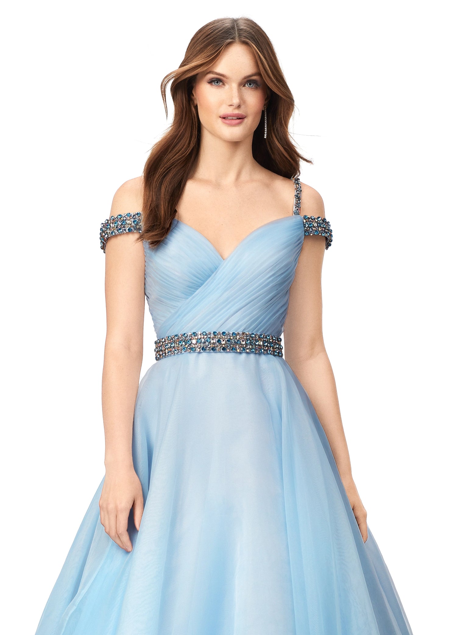 Unleash your inner diva with this off-shoulder organza ball gown. The sweetheart neckline and ruched bodice add a touch of glamour, while the encrusted rhinestones on the spaghetti straps, off-shoulder straps, and belt will make you shine like a star. Perfect for those special occasions when you want to make a dazzling statement!