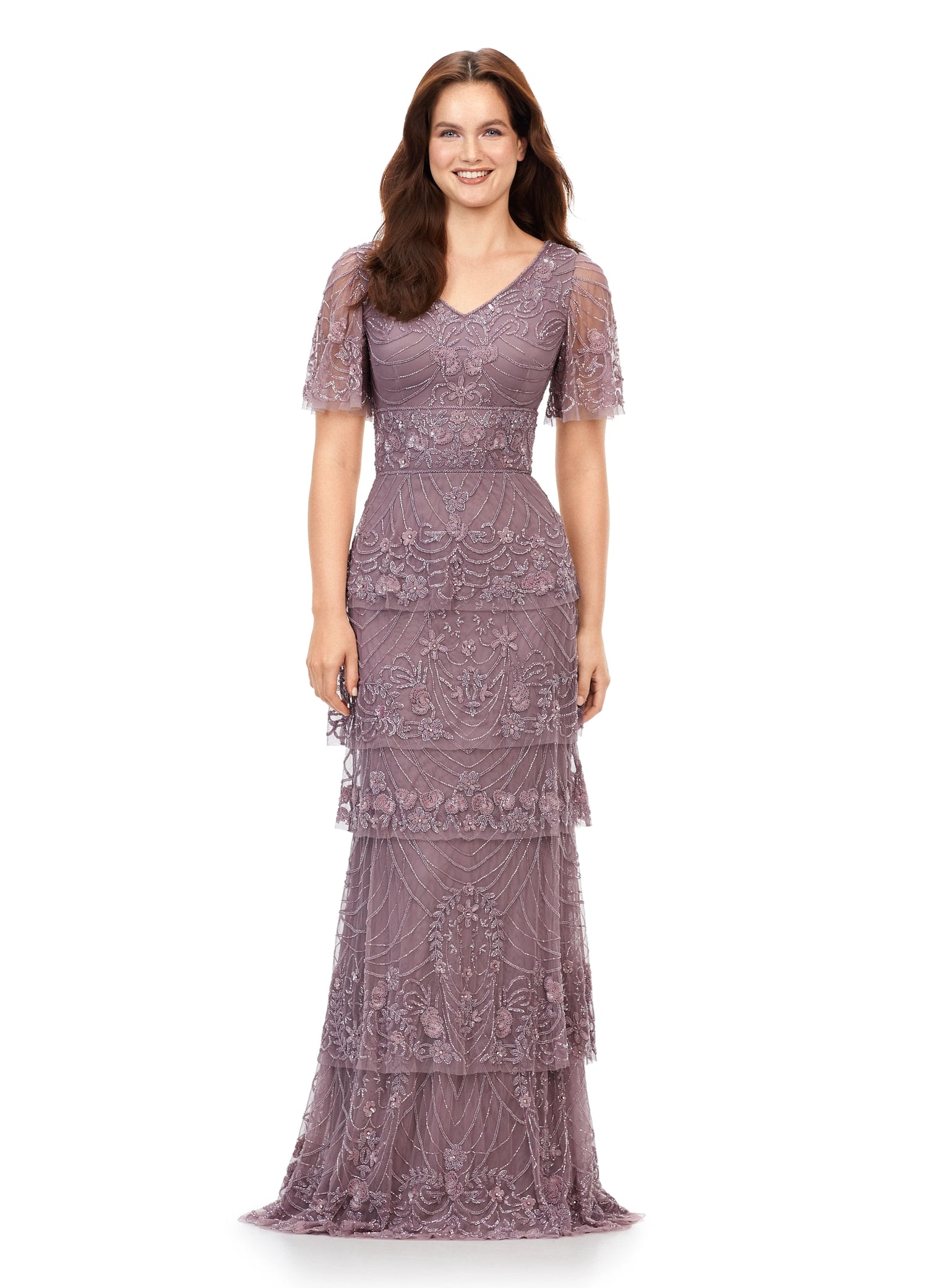 This elegant sequin gown features a v-neckline with butterfly flutter sleeves. The wide waist band is sure to cinch the waist and provide the perfect silhouette. The bustier and multi tiered skirt are accented with the same intricate floral bead pattern throughout.