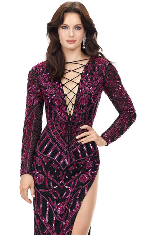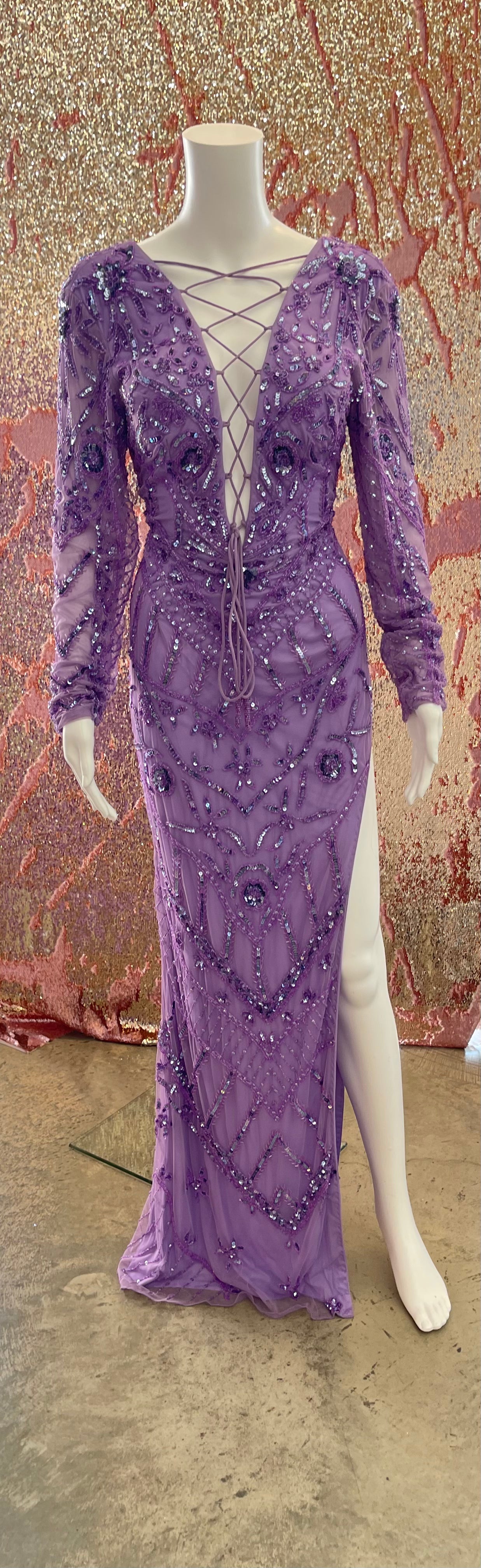 This dramatic gown is embellished with an intricate bead pattern. The dress is complete with a lace up bustier and a left leg slit.