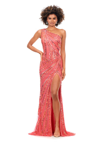 This one-shoulder gown features an intricate bead pattern that will accentuate your curves. The look is complete with a left-leg slit and our signature asymmetrical lace-up back.