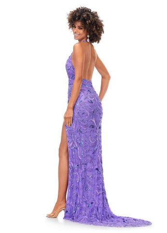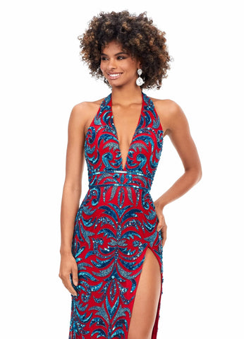 This gown features a v-neckline and open back. With intricate beading throughout this gown will make you look and feel like a star!