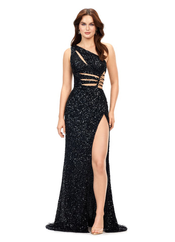 Make a statement in ASHLEYlauren's 11288 one shoulder gown. The luxurious fabric and timeless construction of this gown are sure to turn heads, with its modern cut outs and intricately beaded waistline for an alluring look. Featuring a left leg slit and sweep train, you'll make a lasting impression as you gracefully walk into the room.