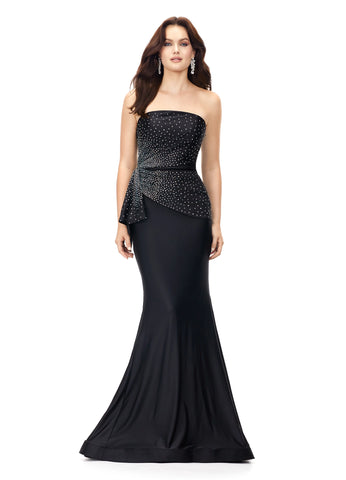 Turn heads at your special event in this ASHLEYlauren 11295 strapless gown. Show off your curves in just the right way with its wrap bustier and dramatic knot at the waist. The look is finished off with hot press stones and a sweeping train, perfect for an unforgettable entrance.