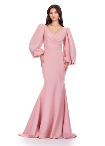 Make a statement in the ASHLEYlauren 11345 gown. The draped v-neckline adds an elegant touch, while the bishop sleeves and sweep train bring a chic flair. Crafted with scuba material, this fitted gown is perfect for any special occasion.
