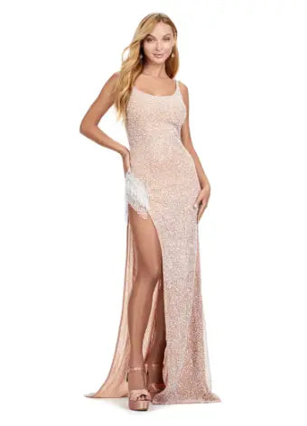 Step out in old Hollywood glam with this fully beaded gown. The intricate fringe and crystal accents add an extra touch of luxury. Designed with a scoop neckline and spaghetti straps, topped off with a fringe encrusted slit. Get ready to shine in this elegant, exclusive piece.