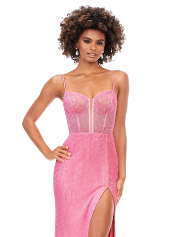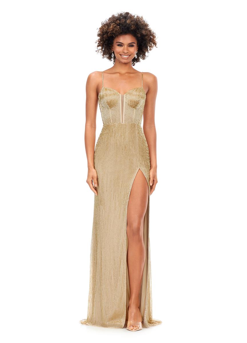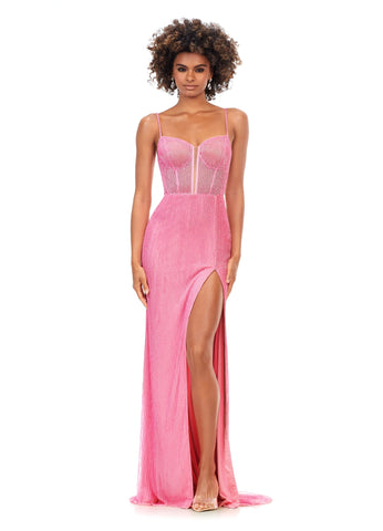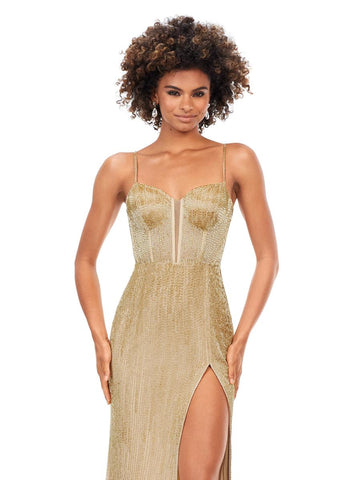 This liquid beaded style features an exposed bustier that is sure to accentuate your curves. The look is complete with sweep train and left leg slit.