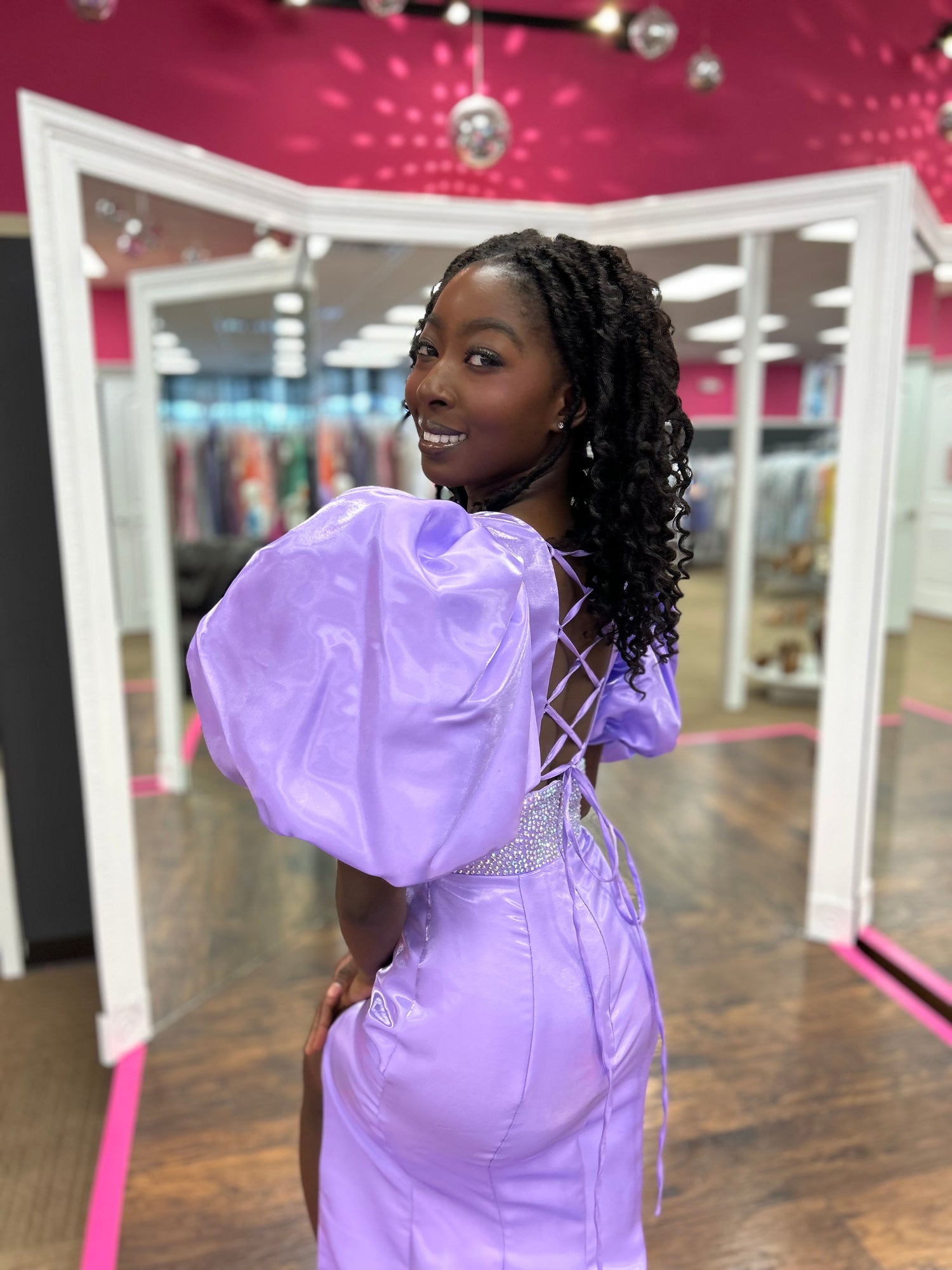 Sparkle and shine in ASHLEYlauren 11379! With a deep v-neckline and oversized puff sleeves, this dress is both stylish and fun. The waistband is embellished with scattered heat set stones, adding just the right amount of bling. And to top it off, a lace-up back adds a touch of playful flirtiness.