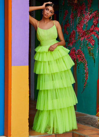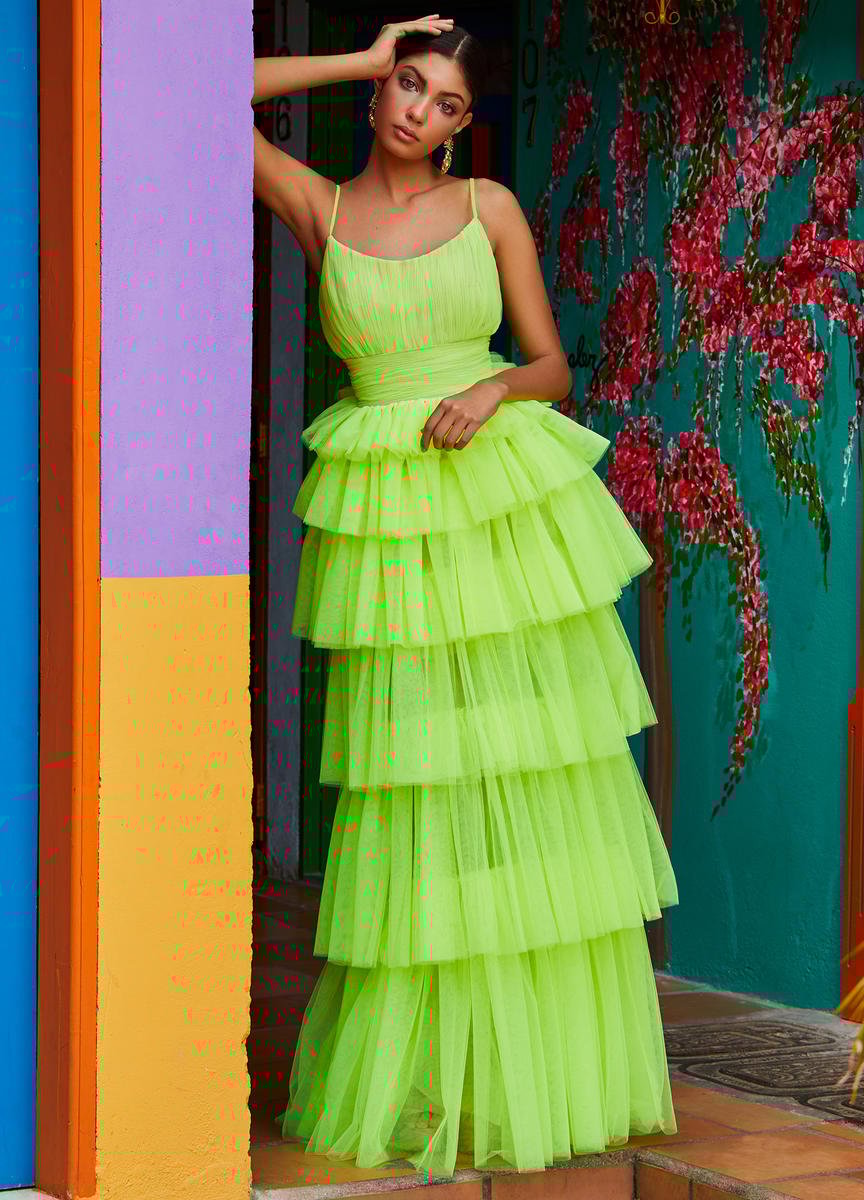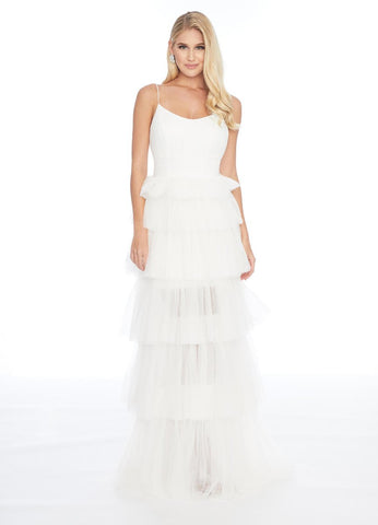 Indulge in elegance with ASHLEYlauren 1744. Featuring a tiered tulle skirt, scoop neck, and long formal design, this dress is the epitome of sophistication. Stand out at any event with this graceful and timeless piece.