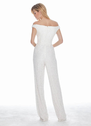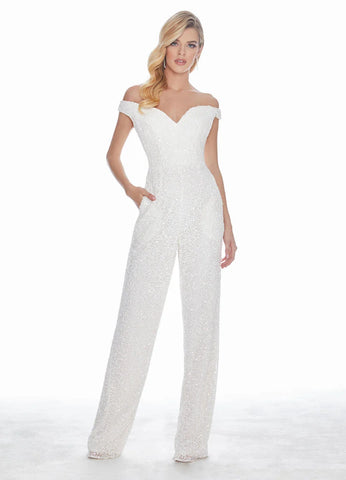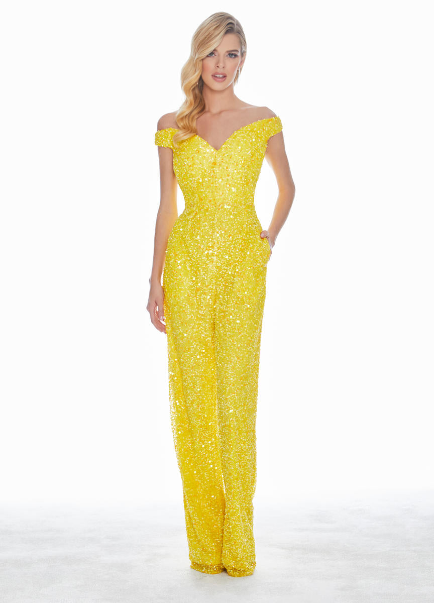 Make an entrance in this fully hand beaded off the shoulder jumpsuit. This jumpsuit has a sweetheart off the shoulder bustier and straight leg pants. The pants are complete with pockets.