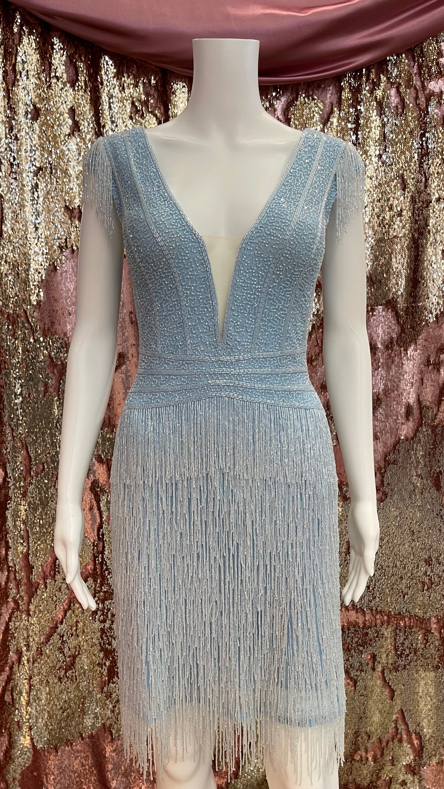 Fabulous in fringe! This fitted beaded cocktail dress with v-neckline features a cap sleeve with fringe shoulder details! The beading along the waist perfectly accentuates your curves. The fully embellished fringe skirt completes the look.