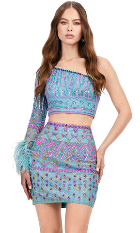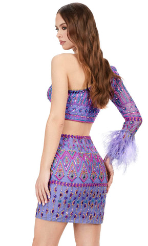 At the next event, make a stunning entrance in the ASHLEYlauren 4597. Crafted from high-quality fabrics with intricate bead and sequin embellishments, this two-piece cocktail dress features a one-shoulder neckline with a beautiful feather embellishment at the end. Look and feel amazing - it's time to shine!