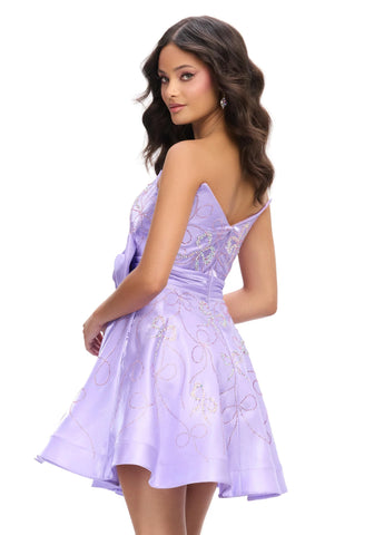 This stunning cocktail dress features press on stones in a cute bow design. The look is finished with an oversized satin bow along the waist and an A-line skirt.