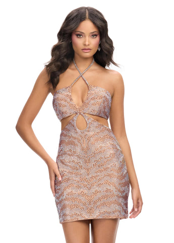 Stand out with this cocktail dress completed with stunning animal print inspired beadwork, illusion cut outs and a head turning halter neckline.