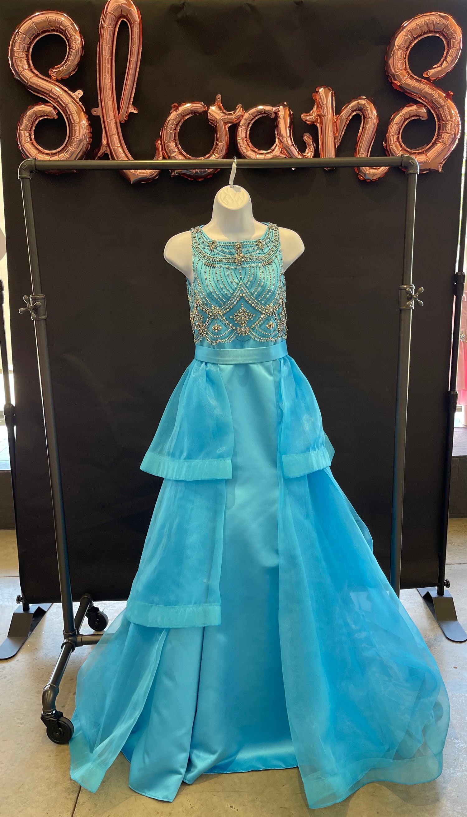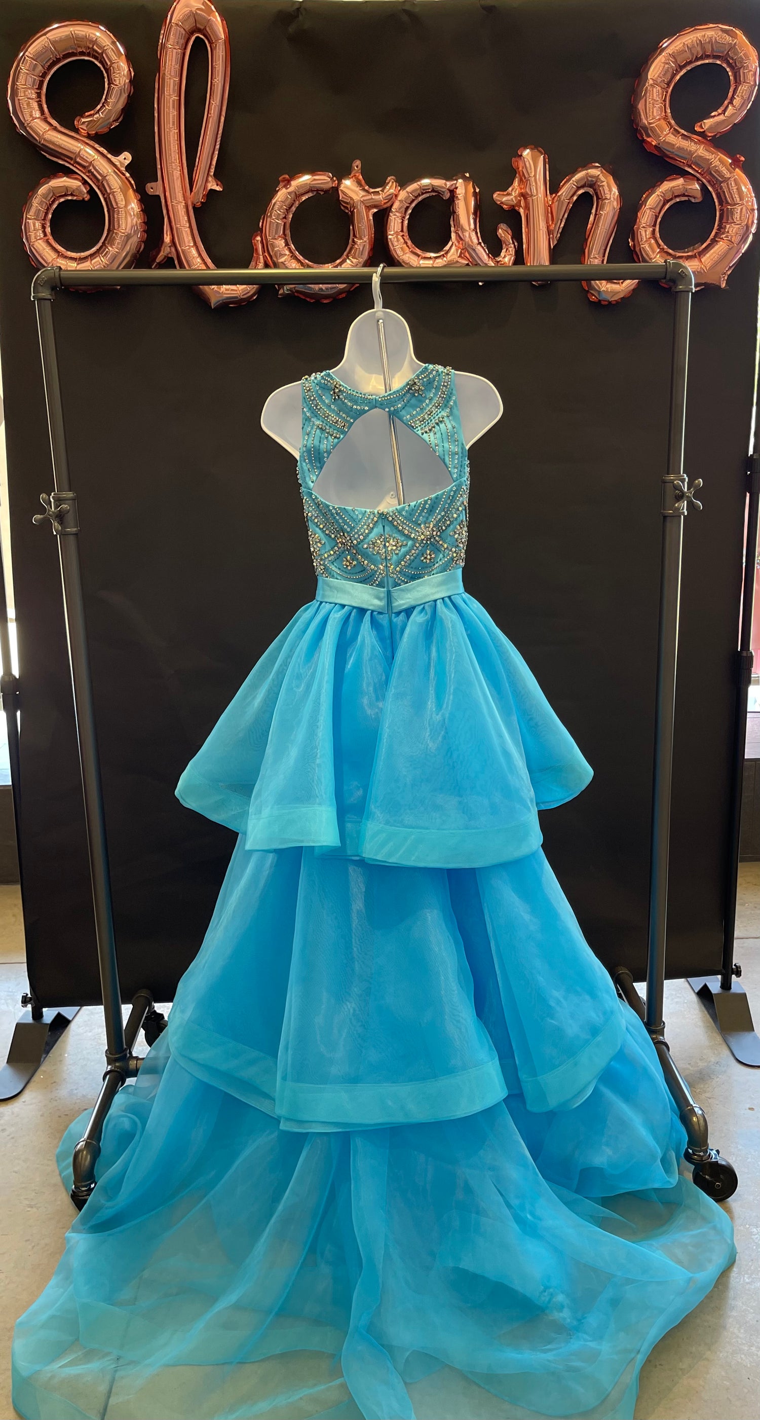 This ASHLEYlauren 8022 dress is the perfect showstopper for your little one! Crafted from luxurious satin, it features a stunning 3-tier tulle train that can easily be detached. With sparkling crystals adorning the bodice, it's sure to turn heads on the runway or at pageants. Shine bright like a diamond!