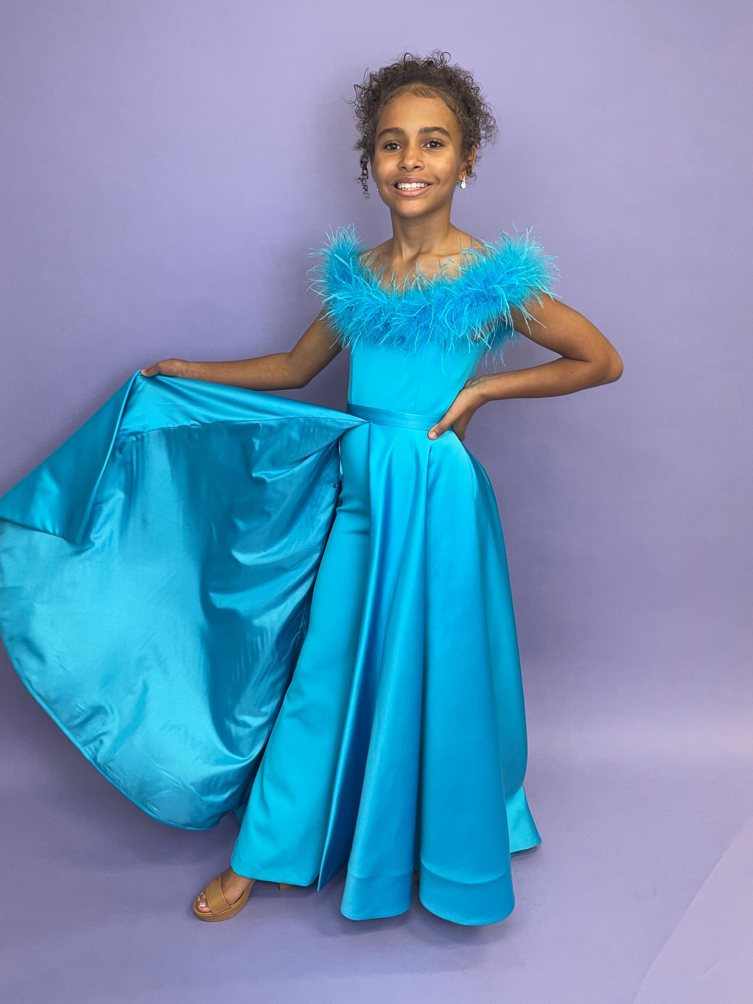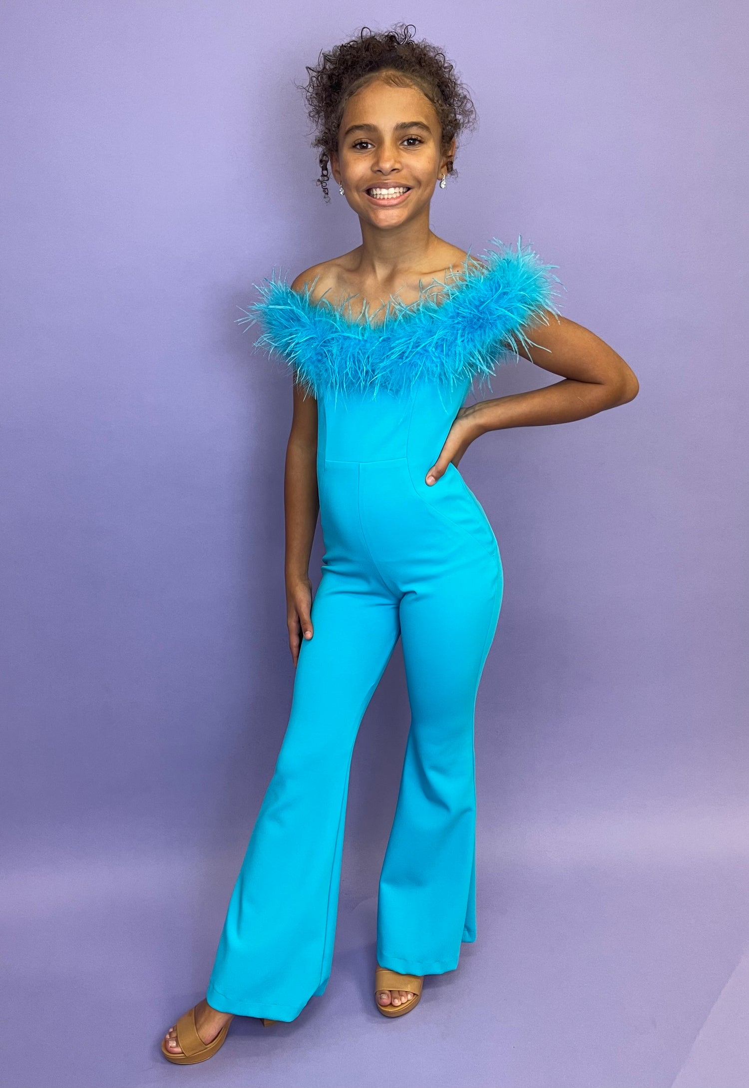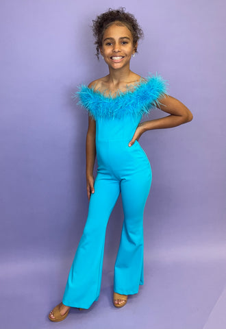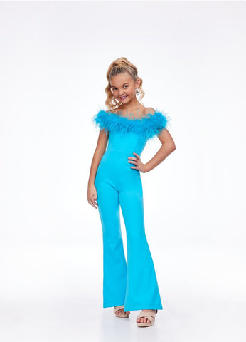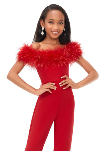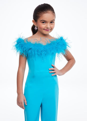 This ASHLEYlauren 8114 formal jumpsuit is perfect for any special occasion. It features an elegant off-the-shoulder style and a feather neckline for a unique, show-stopping look. Crafted from high-quality material, your little one will look their best.