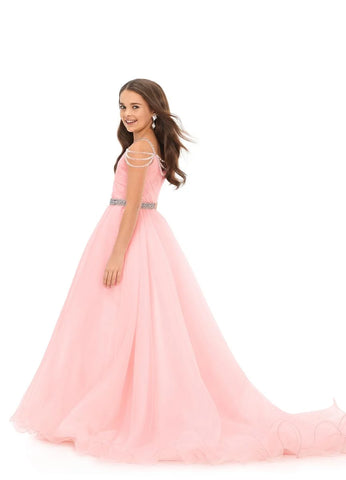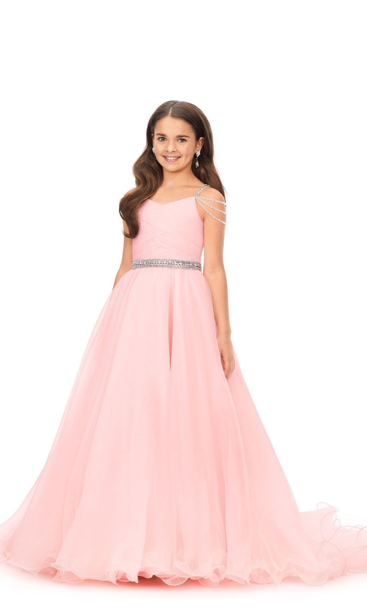 Dress them in this stunning kids' organza ball gown with a v-neckline, ruched bodice, and crystal belt for a show-stopping look. The full a-line skirt adds a touch of elegance, while the draped beaded straps on the back and shoulders add a playful touch. Perfect for any special occasion!