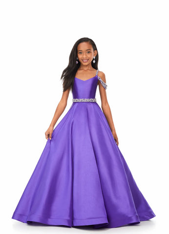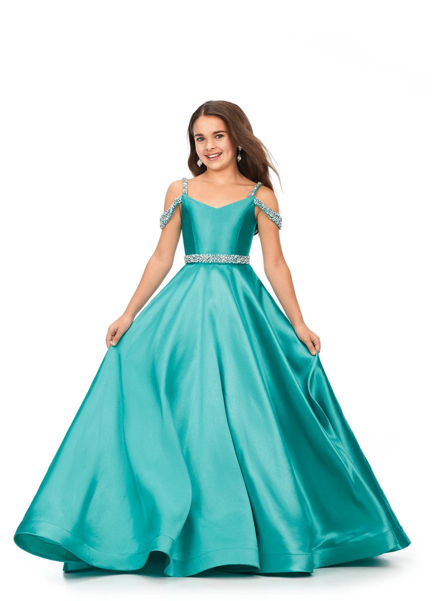 Get ready to wow the crowd in the ASHLEYlauren 8183 kids gown. With sparkling crystal encrusted straps and a waistline, this elegant gown is perfect for any special occasion. The v-neckline and a-line skirt add a touch of sophistication, making your little one the star of the show.
