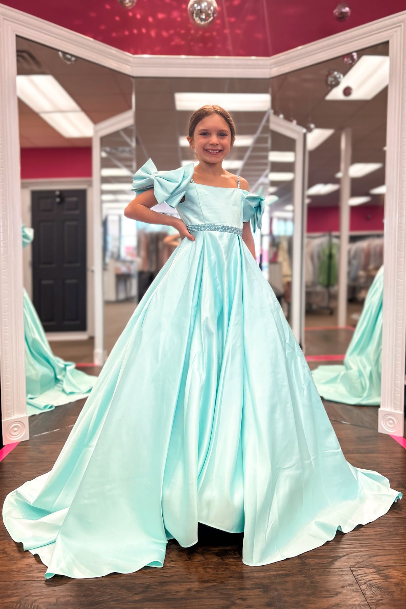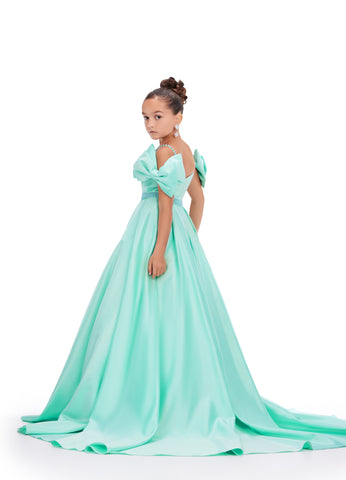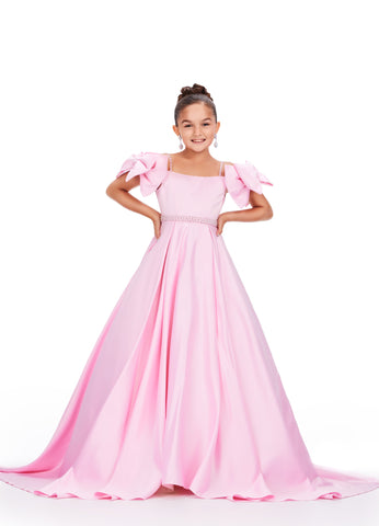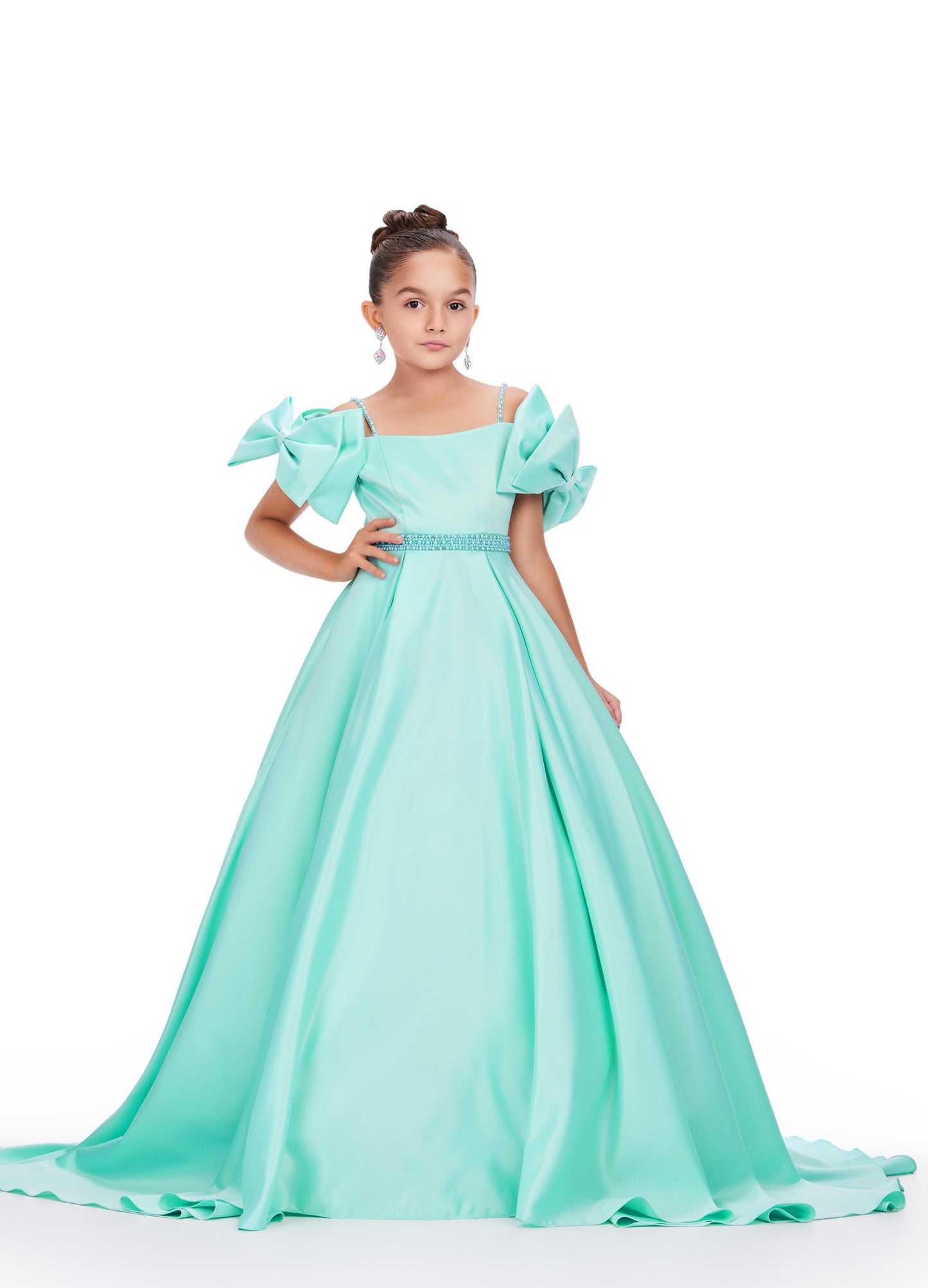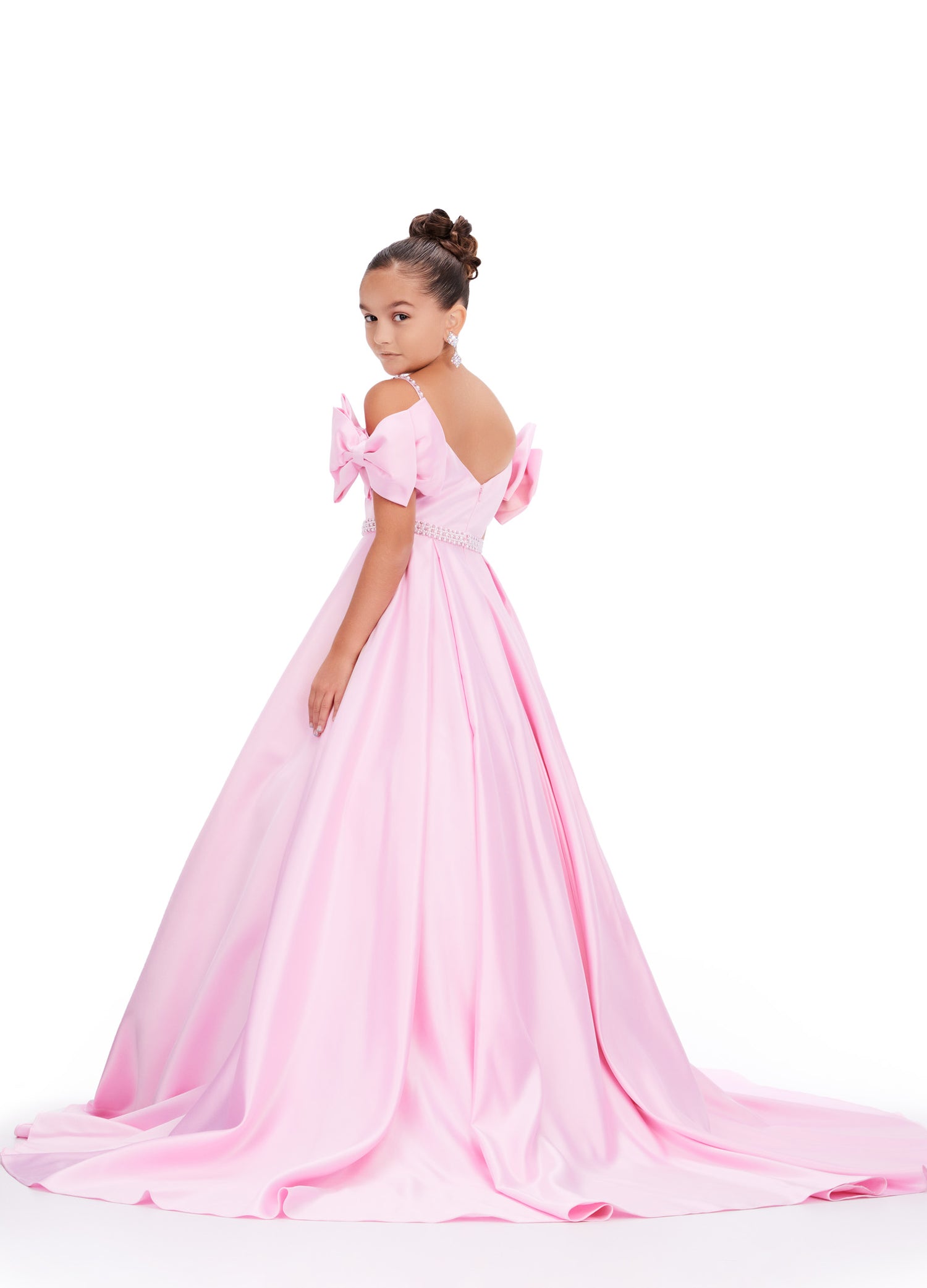 Feel like royalty in the ASHLEYlauren 8237 satin ball gown. With off the shoulder bows and pearl accents, this gown will make you stand out in the crowd. Perfect for any special occasion, this ball gown exudes elegance and grace.