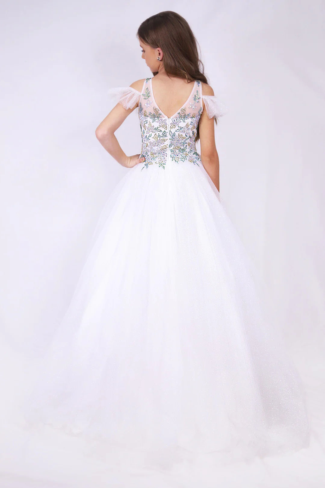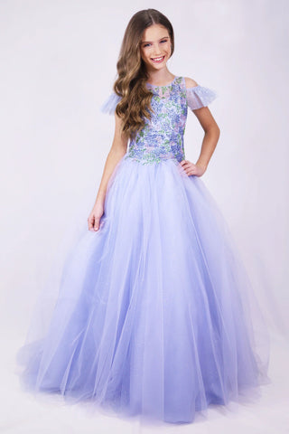Look like a pageant star in the ultra-chic Ava Presley 27737 dress. Featuring a flowy silhouette, this gown is elevated by layers, a v-back, and off the shoulder detail for a sophisticated look. Perfect for the little fashionista.