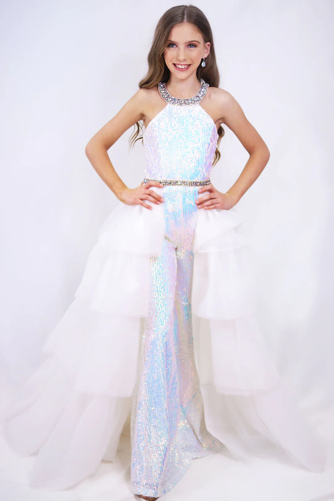 Be the star of the show with the Ava Presley K27725 Pantsuit. This unique outfit features a stylish over skirt and high neck, perfect for pageants and kids formal events. Make a statement with this one-of-a-kind ensemble.