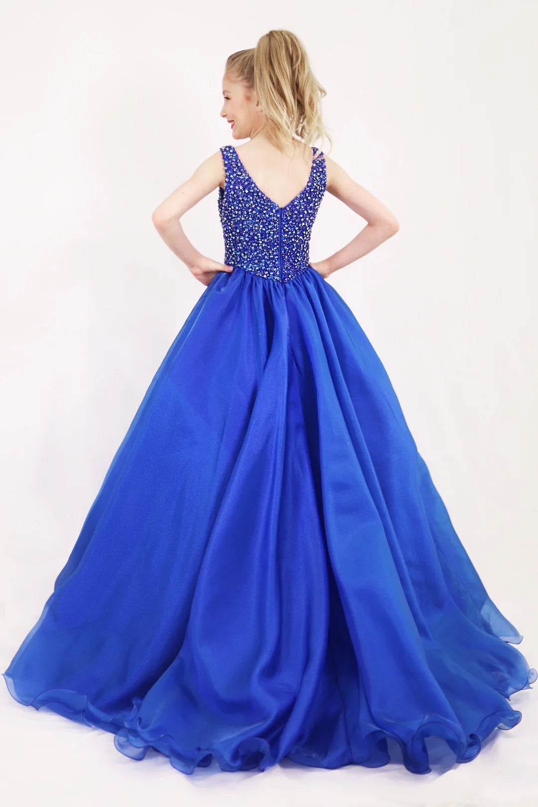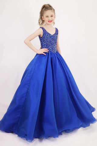 This darling little girl formal includes a beautiful floor length sequined gown made with a beaded lace bodice. This dress is perfect for pageants.