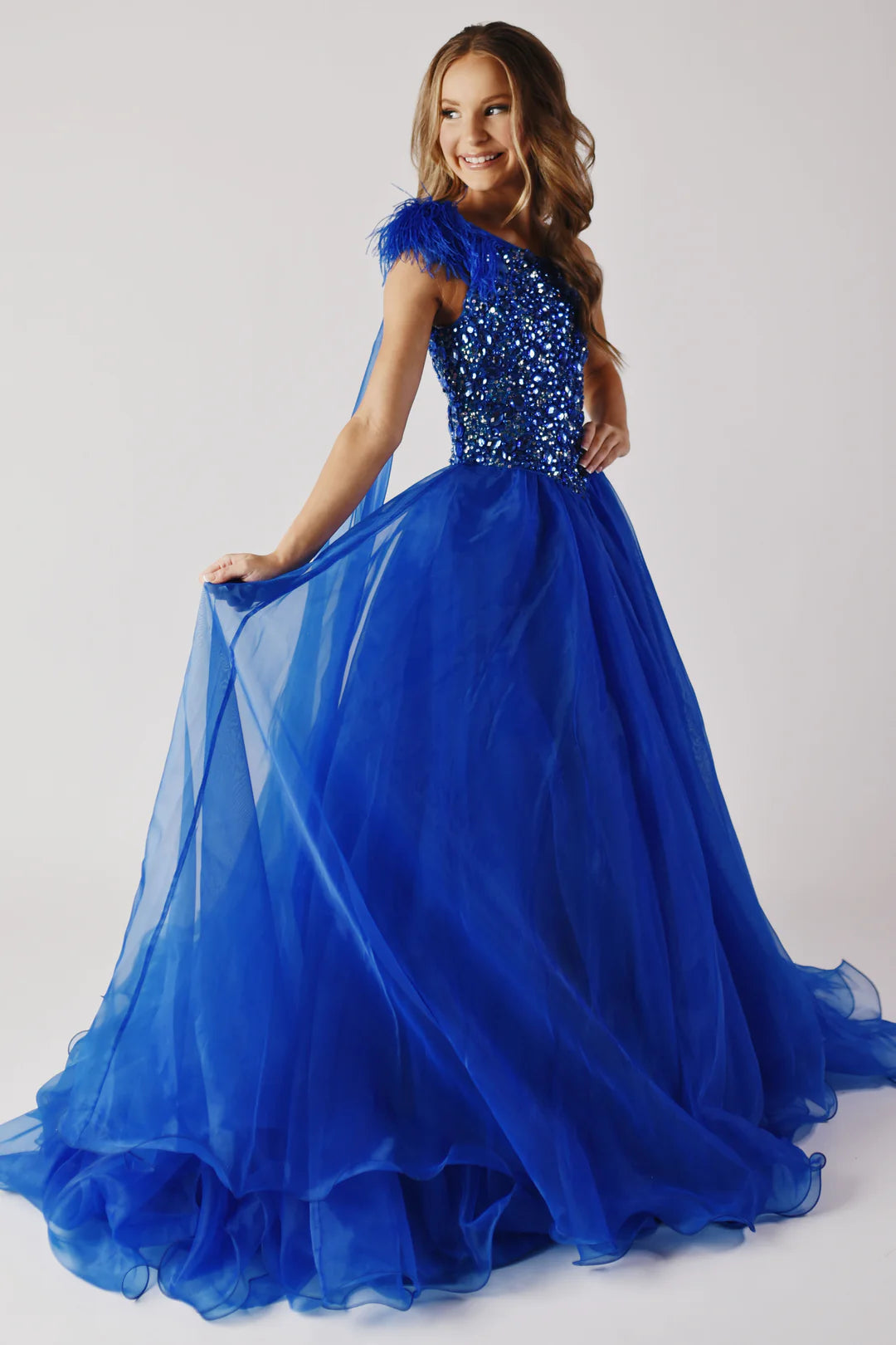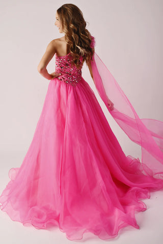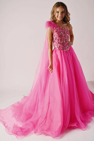 Get your little one ready to win the pageant with Ava Presley K38022! This flowy dress features a unique one-shoulder cape and playful feather accents. Perfect for formal events, this dress will make your child stand out and feel like a star!