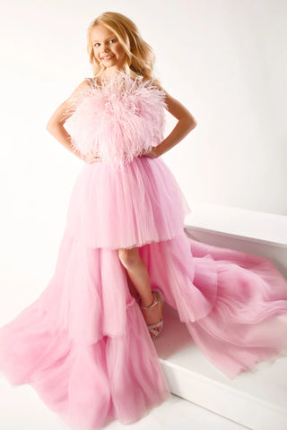 Your little princess will light up any room in this exquisite Ava Presley K38030 dress. Its unique silhouette, with its high-low design and feathers makes it perfect for any formal occasion. She'll look like a star in this special showstopper!