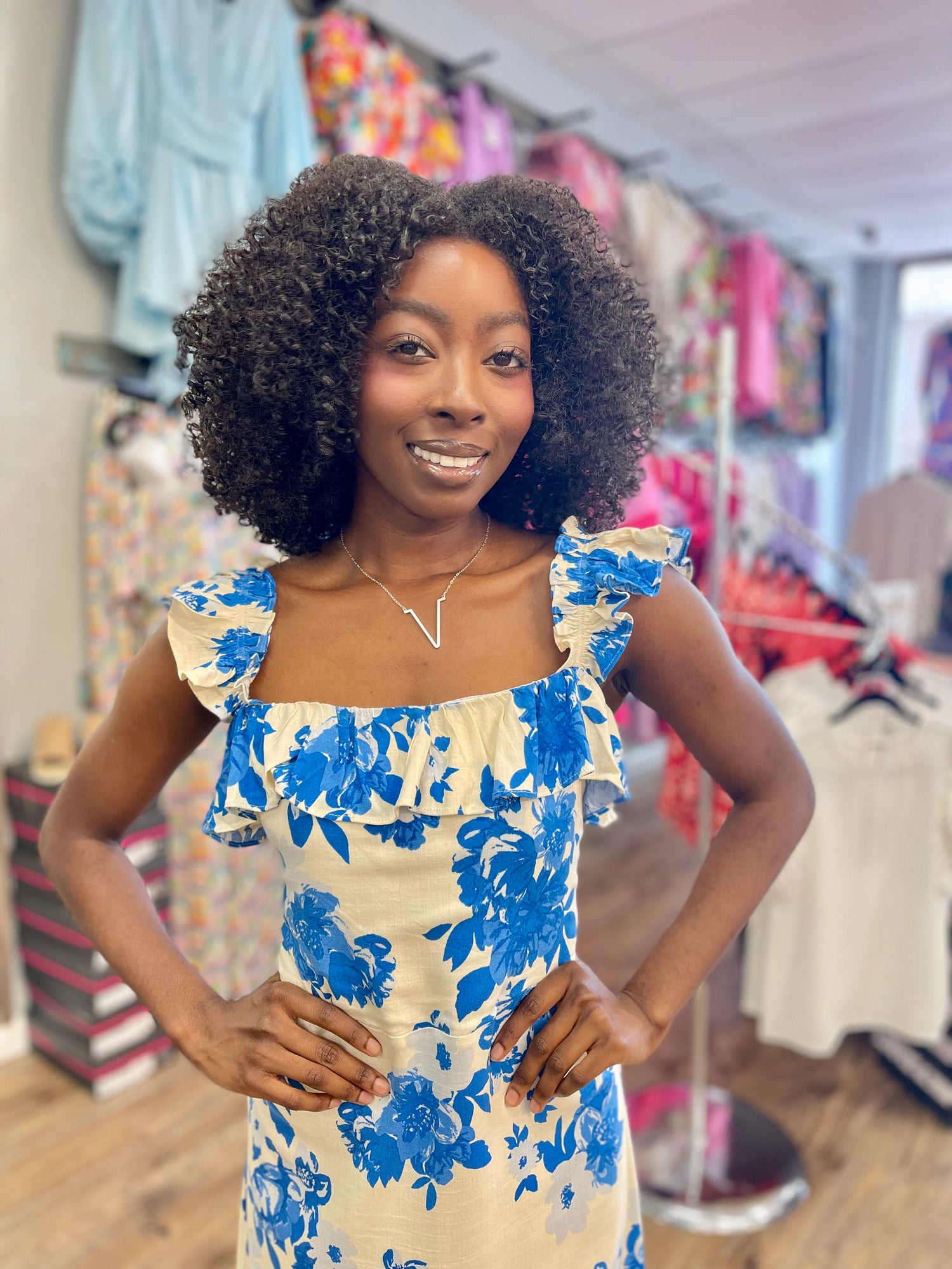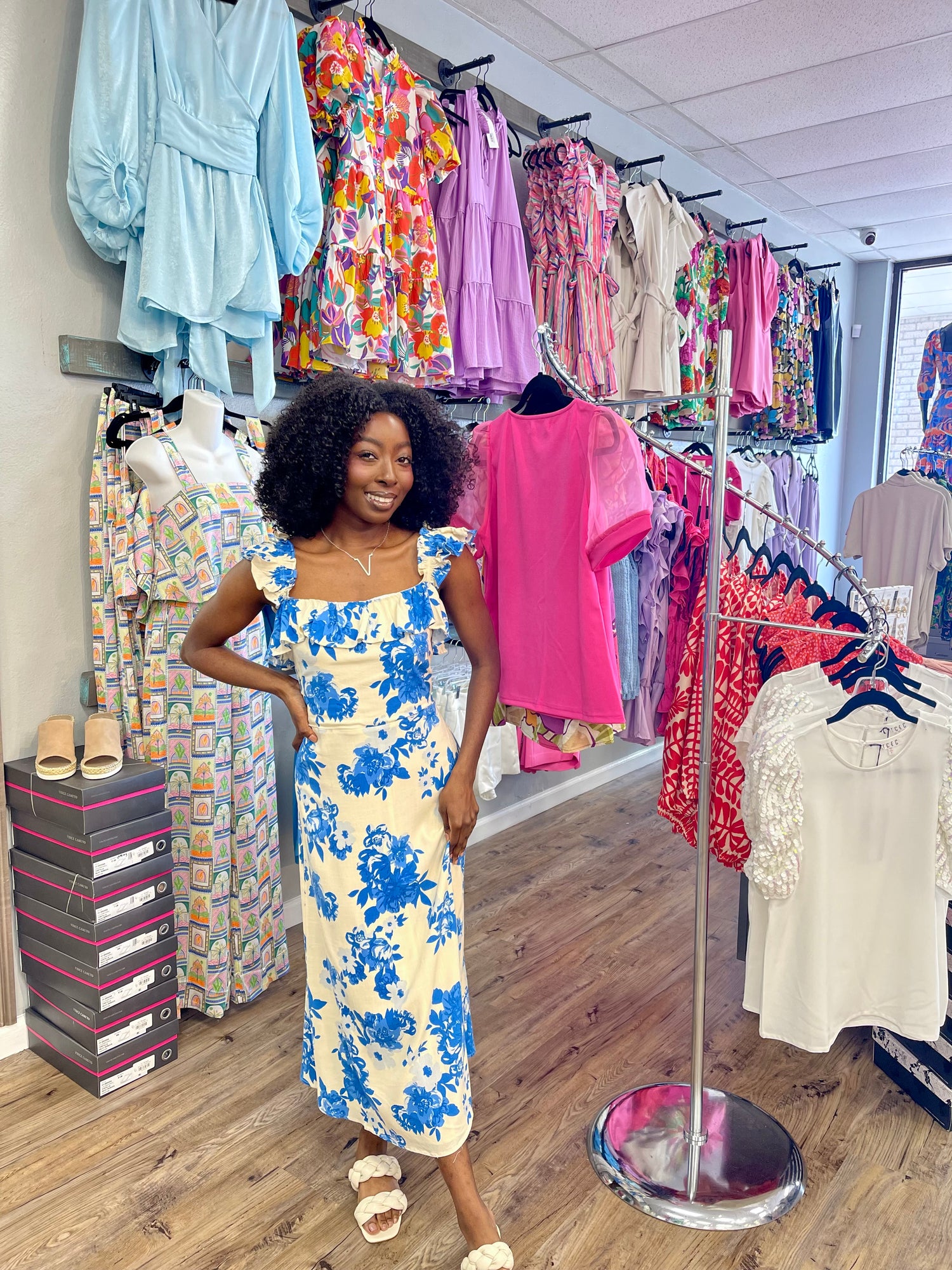 The Azure Kona Ruffle Midi Dress is a timeless piece that combines coastal charm with chic elegance. The ruffle straps and neckline add a touch of femininity, while the smocked back ensures a comfortable fit. The classic shape and stunning blue ivory color make it the perfect dress for any occasion. Complete the look with gold accessories for a polished and effortless style.