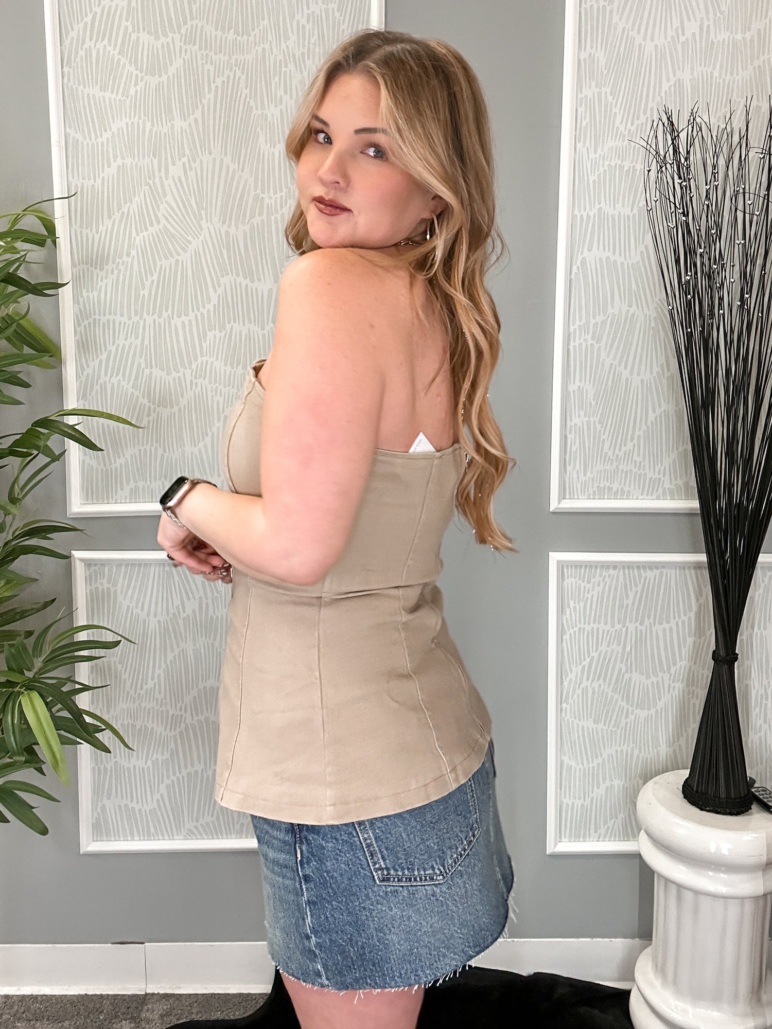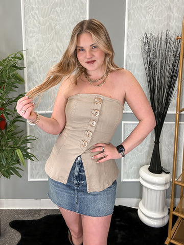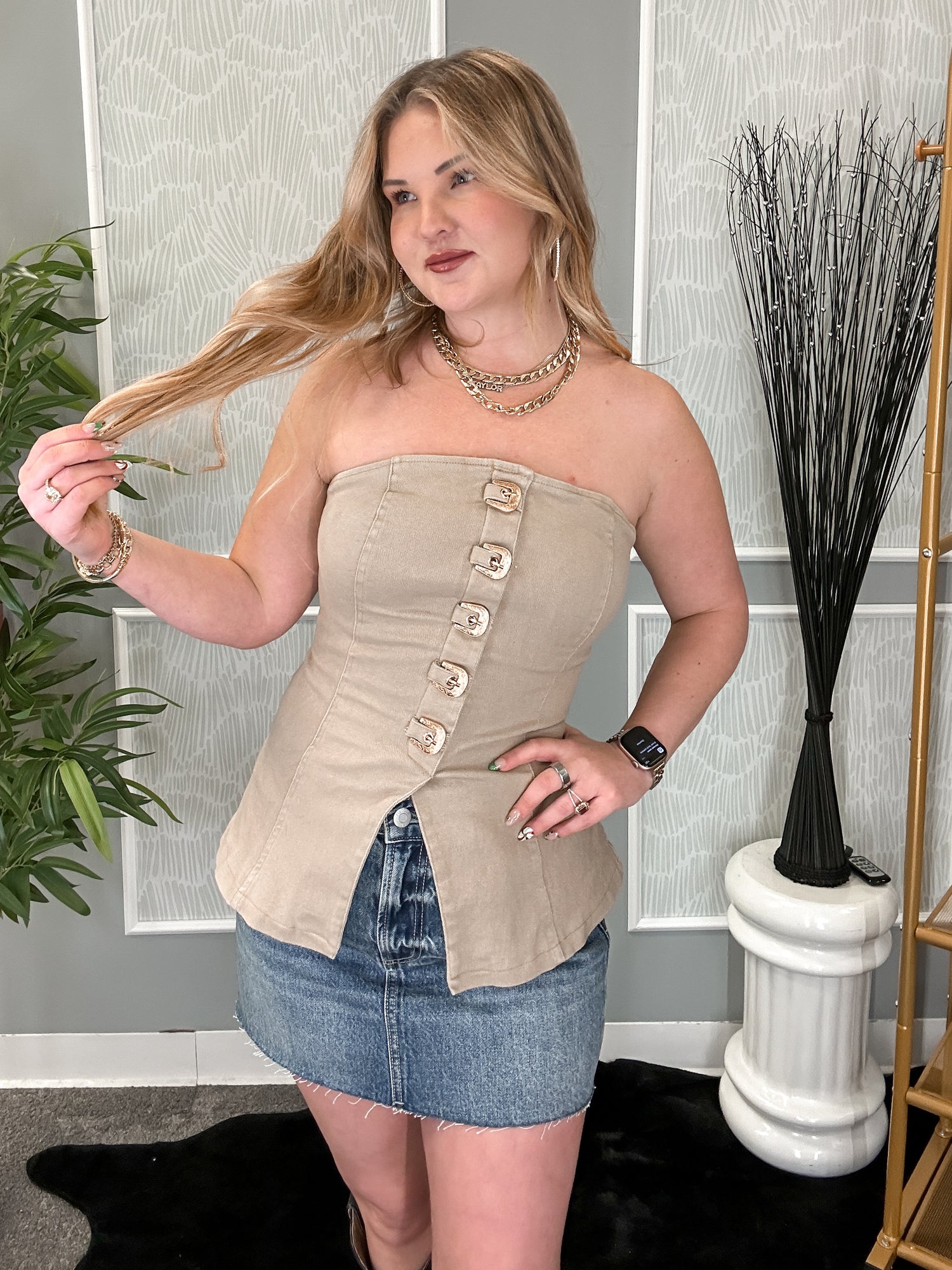Elevate your denim game with this striking strapless jean top, featuring eye-catching gold belt buckles that add instant edge and sophistication. The sleek strapless design offers a modern, versatile silhouette perfect for pairing with your favorite bottoms. A must-have for anyone seeking to refresh their wardrobe with contemporary style and undeniable flair.