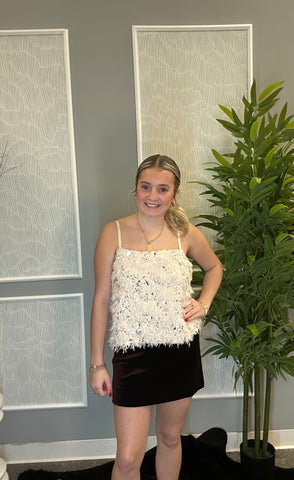 Turn heads in the Blakelyn Top, a bold statement piece made for standout moments. This cropped top features delicate spaghetti straps and is adorned with luxe fur accents and shimmering sequins for a glamorous, high-impact look. Playful yet elevated, the Blakelyn Top is perfect for nights out, special events, or whenever you want to add sparkle and texture to your outfit. Pair it with high-waisted bottoms for a confident, fashion-forward style.