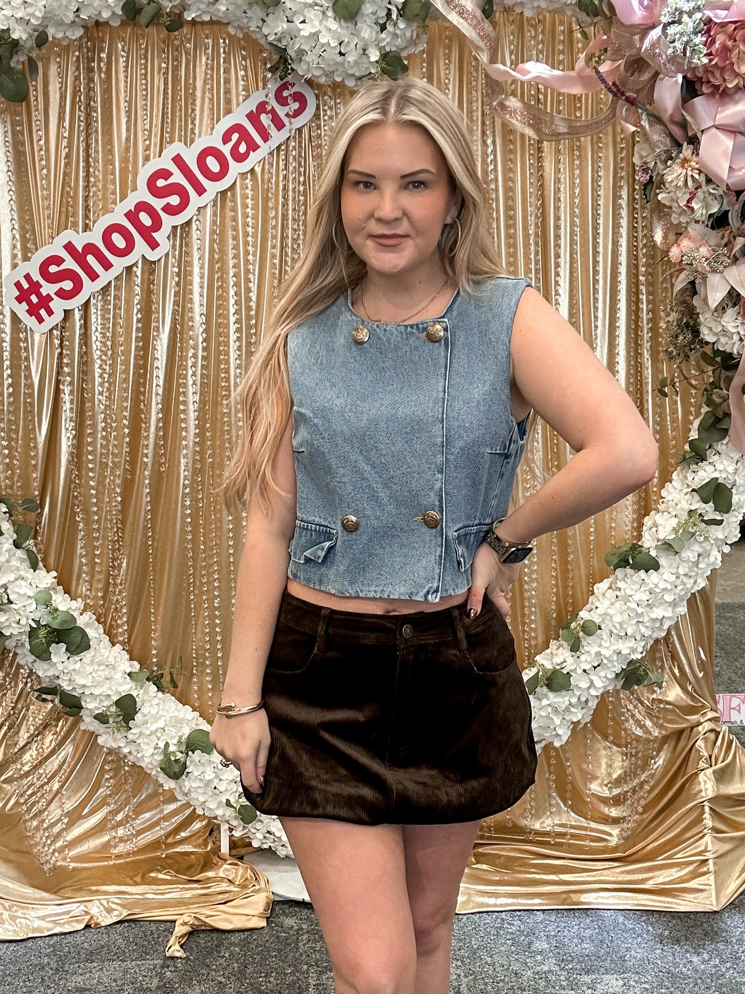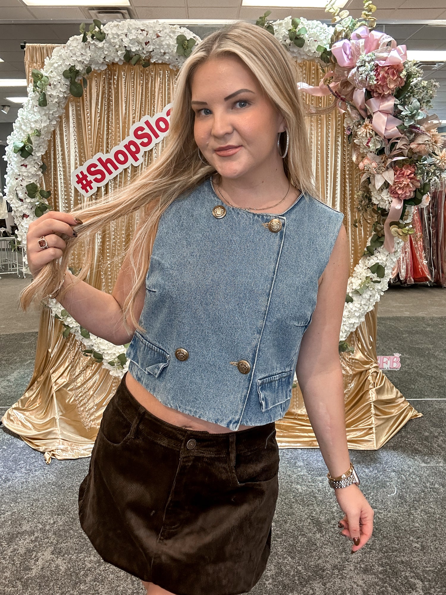 Upgrade your denim game with the Steve Madden Brea Vest, a modern twist on a classic layering piece. Designed in a Forever Blue wash, this cropped vest features an asymmetrical button-front closure with bold gold-tone hardware for a polished yet edgy vibe. With its structured silhouette and tailored details, the Brea Vest is the perfect top or layering piece to style across seasons.
