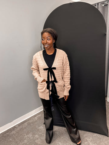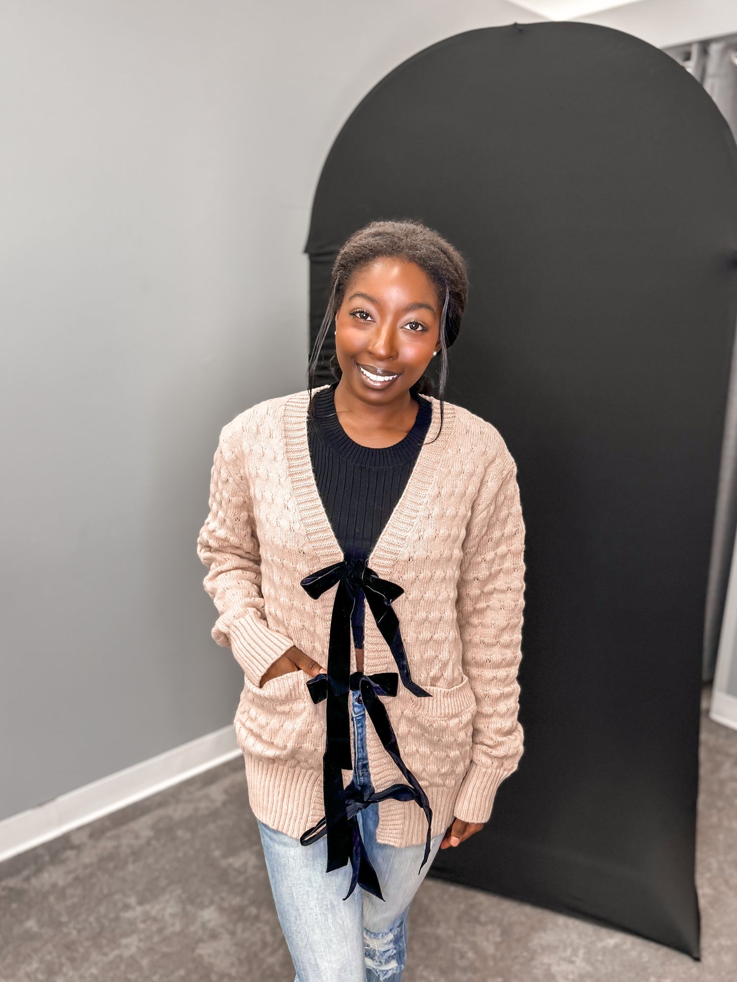 This bubble knit cardigan is the perfect combination of style and comfort. With a charming ribbon bow closure, it adds a touch of playfulness to any outfit. The soft material ensures you'll feel as good as you look. Stay cozy and trendy with this must-have cardigan.