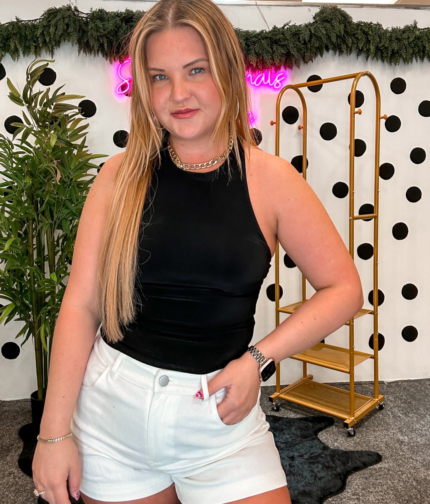 Style it with high-waisted shorts, denim, or a skirt for a chic, put-together look that effortlessly transitions from day to night.
