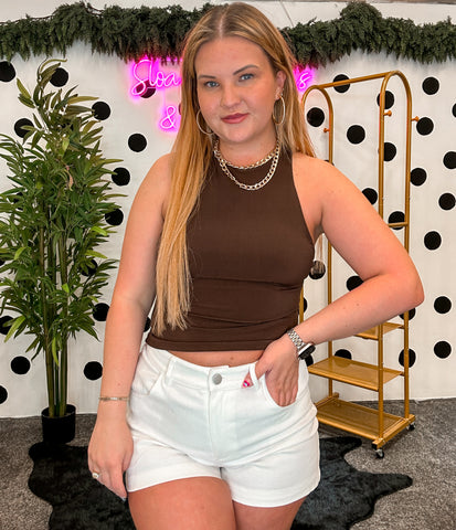 Made from a smooth, stretchy fabric, this fitted halter top hugs in all the right places while keeping you comfortable all day (or night) long. Available in classic black and rich brown, it’s the perfect piece to dress up or down for any occasion.