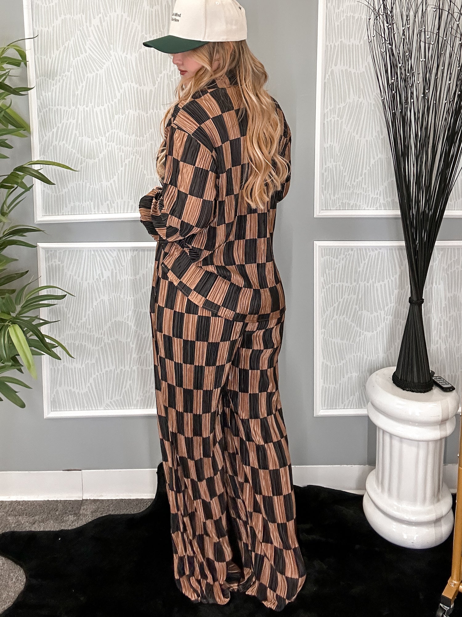 Elevate your wardrobe with this sophisticated checkered set featuring a luxurious satin finish. The coordinated ensemble pairs tailored pants with a flowing long-sleeve top, creating an effortlessly polished look perfect for any occasion. This set drapes beautifully while maintaining comfort throughout your day. Whether you're dressing up for an event or seeking a refined casual outfit, this versatile two-piece delivers timeless style with modern elegance.