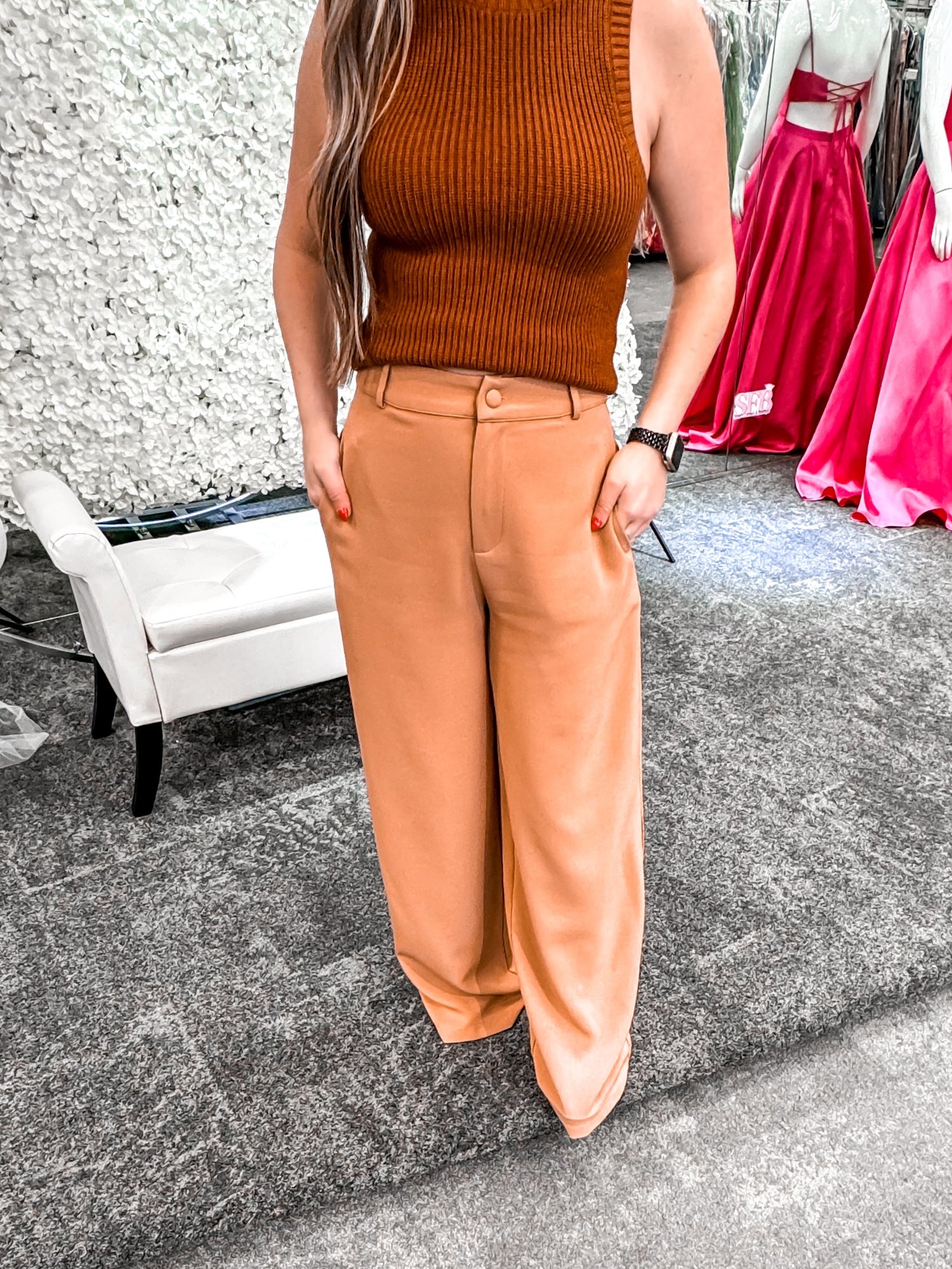 Big boss energy. You'll never want to take these trousers off. They feature a classic button closure and zipper fly, sitting high on the waist. Side pockets add character and convenience, while they maintain a wide leg fit.