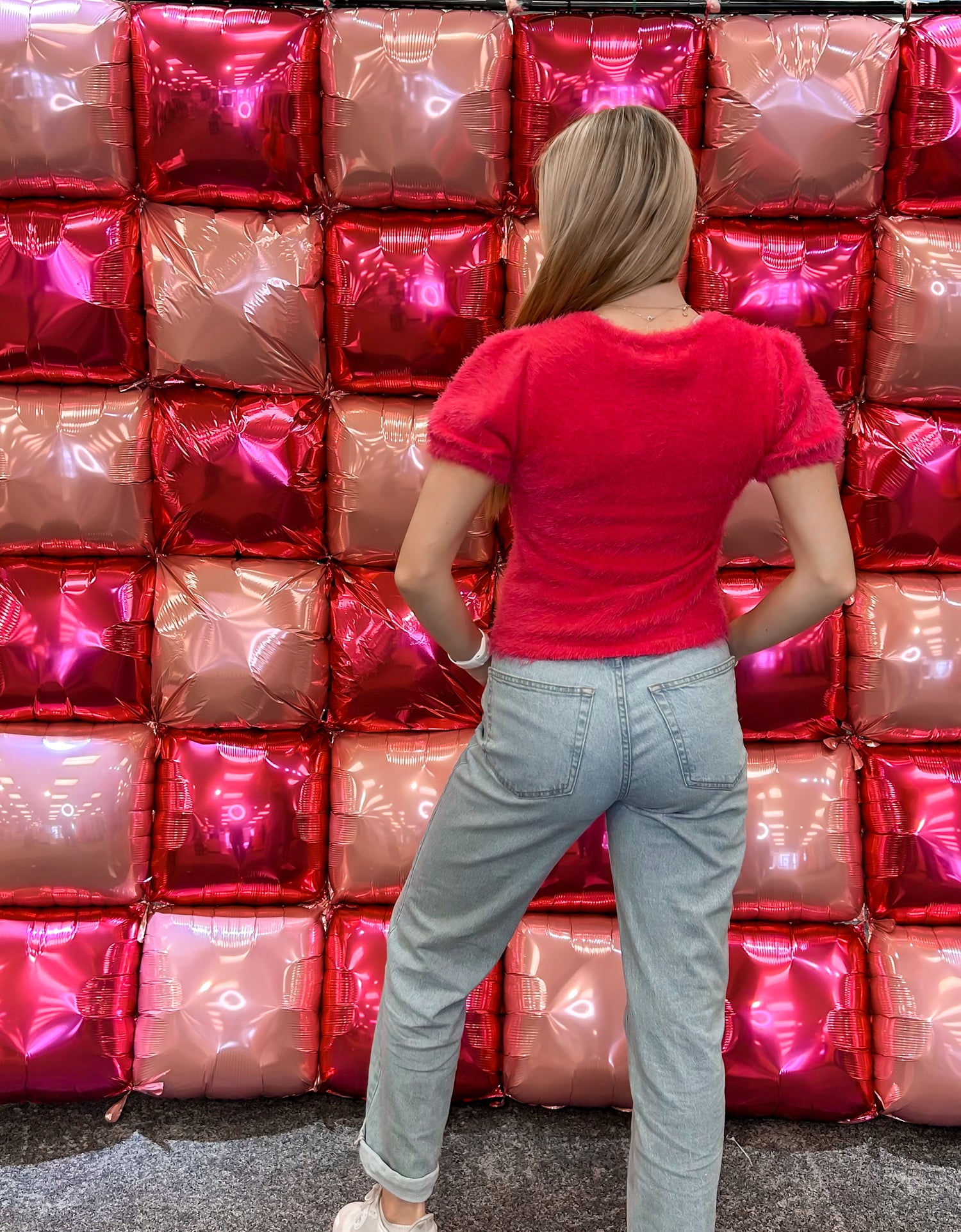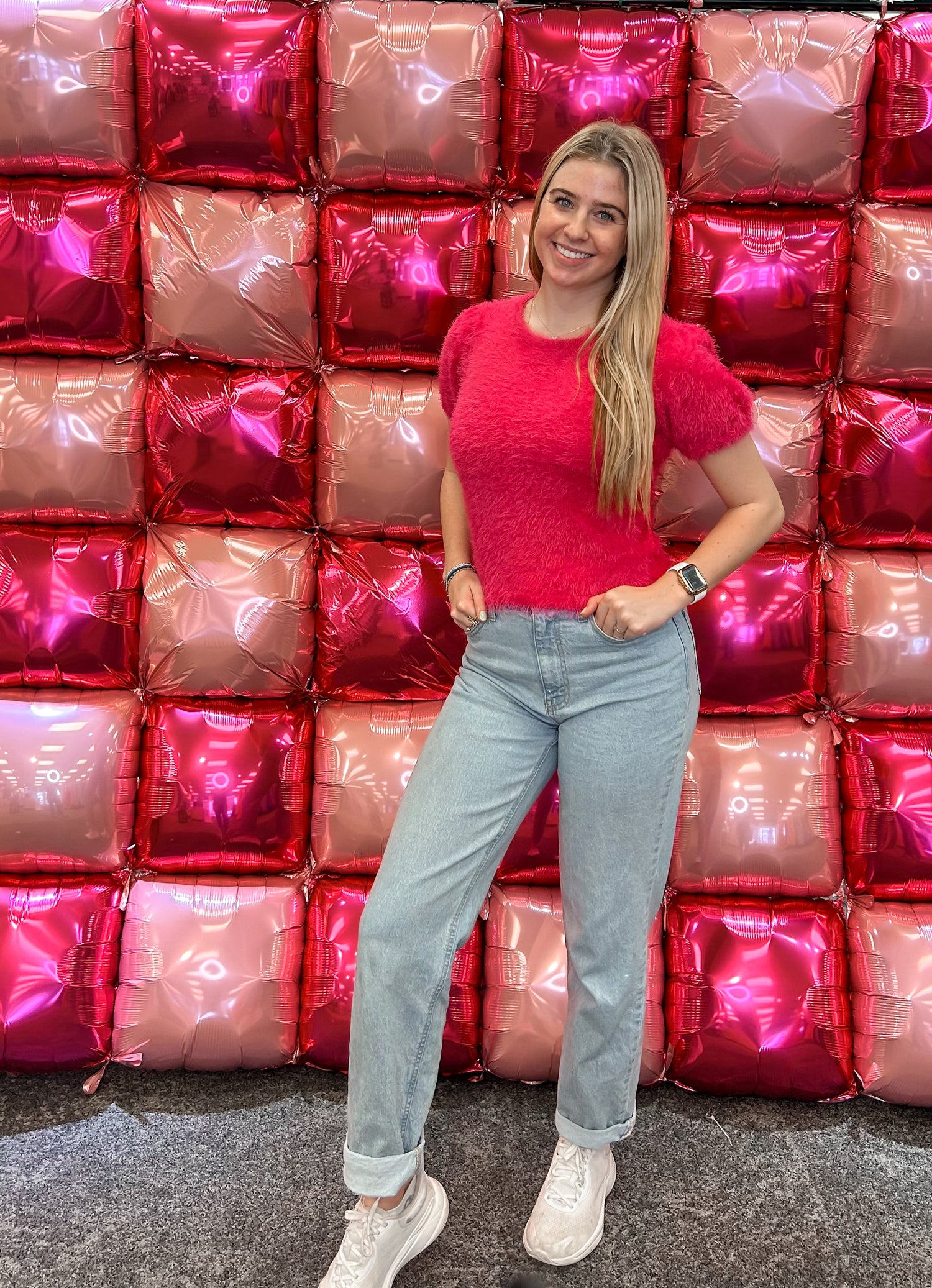 Stay cozy and stylish in our Chelsea Sweater. Made with soft, not itchy material, this fuzzy T-shirt sweater comes in a playful pink color. Perfect for keeping you warm and looking cute at the same time!