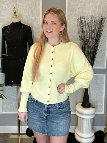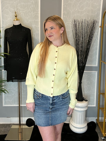 The Chenoa Cardigan is your new go-to layer for transitional dressing—soft, slouchy, and bursting with modern charm. Rendered in a warm butter yellow knit, this cardigan features a relaxed drop shoulder, extra-long ribbed cuffs, and a streamlined front-button closure that lets you wear it open or closed.