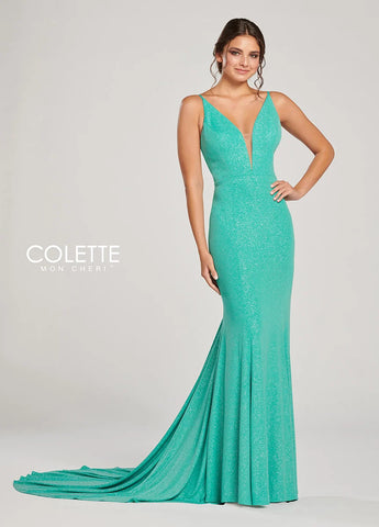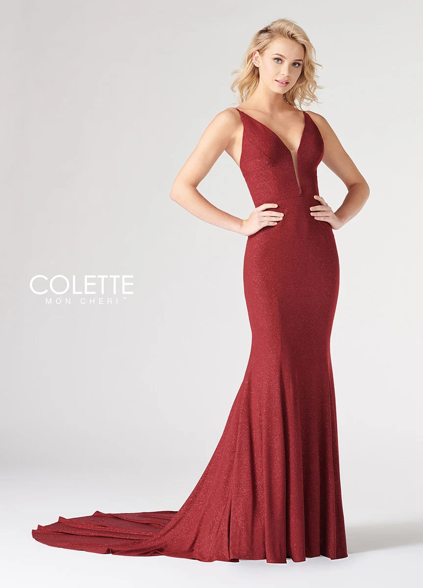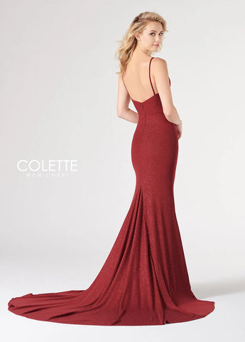 Elevate your presence with the Colette CL19880 gown. The v-neckline plunges, exuding elegance and allure. This long formal gown also features a train for a grand entrance. Boost your confidence and captivate the crowd in this stunning dress.