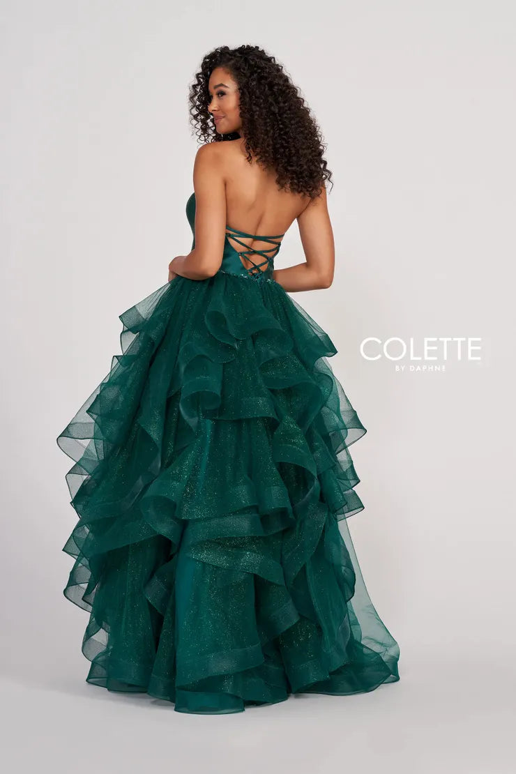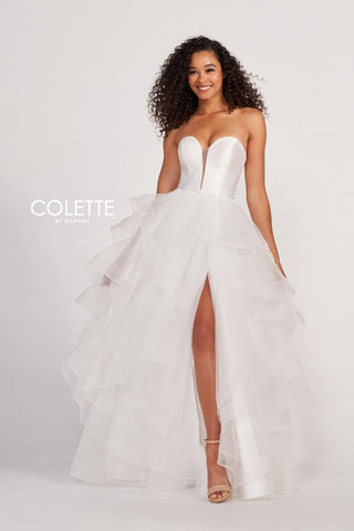 Be the star of any prom or Mardi Gras ball with the Colette CL2006 dress! This strapless gown features elegant ruffles and a daring slit, adding a touch of glamour to your look. Perfect for those looking to make a statement and turn heads.