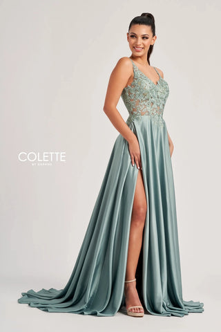 Get ready to turn heads in the Colette CL8160! This stunning A-Line gown features exquisite embroidered appliques, sparkling accent stones, and a corset bodice that will accentuate your figure. With the added convenience of pockets and a modern low back design, this satin gown is perfect for any formal occasion. Plus, with a playful slit and full length, you'll be the life of the party!