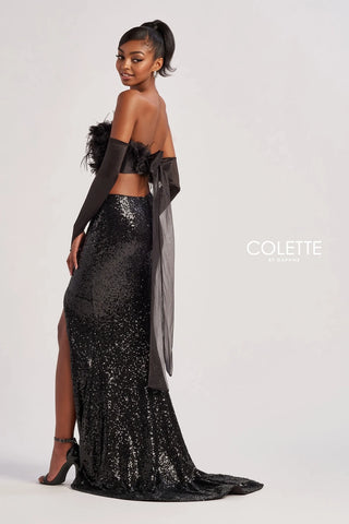 Take a bold risk in the Colette CL8450 gown! With its mermaid silhouette, long skirt, and straight neckline, this dress will make you feel like a fearless adventurer. The feather and three-dimensional flower fabric adds a touch of daring, while the fingerless gloves and spaghetti straps included in this two piece set provide the perfect amount of edge.