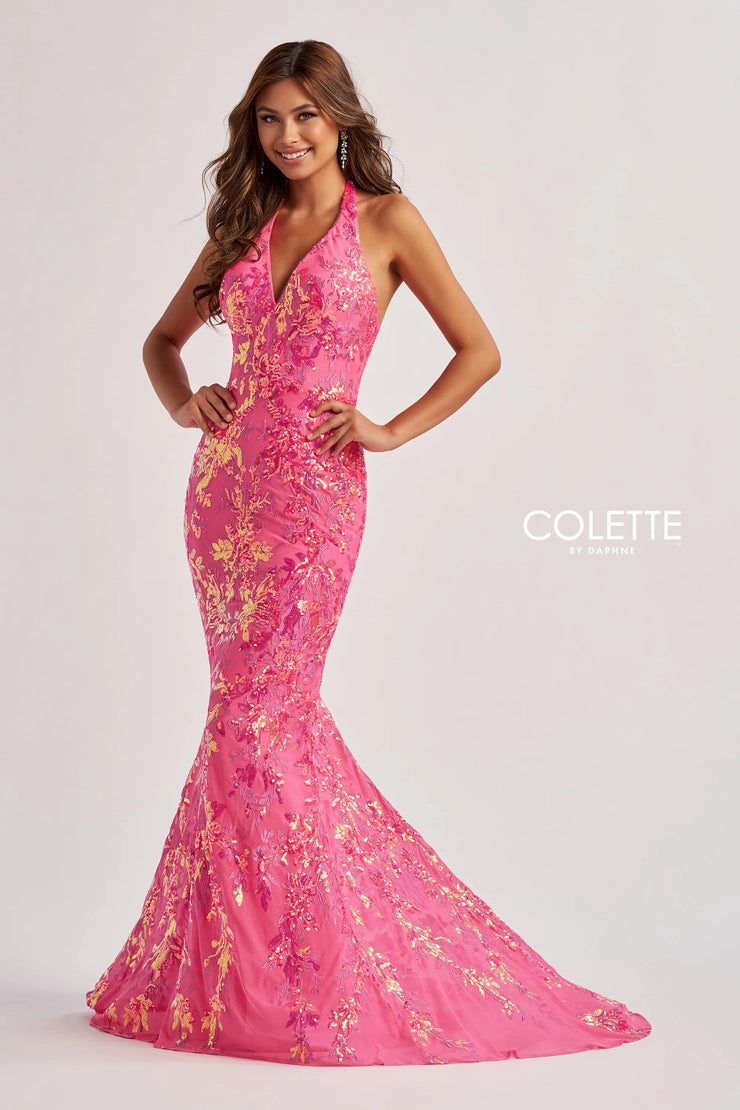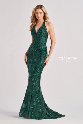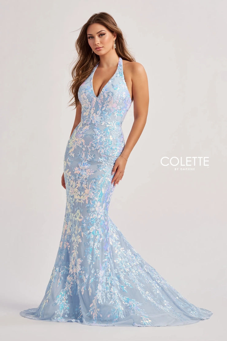 Unleash your daring side with the Colette CL8495 dress! Adorned with embroidered sequin mesh, this long mermaid silhouette will make you the center of attention. The halter V-neckline and sleeveless design add a touch of sultry elegance, while the natural waistline accentuates your figure. Take a fashion risk and stand out in this bold and stunning gown!