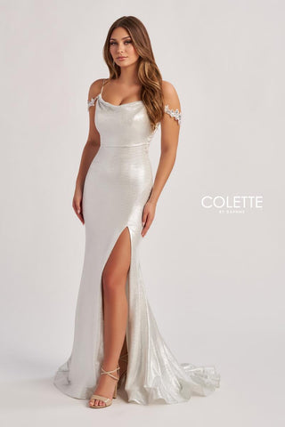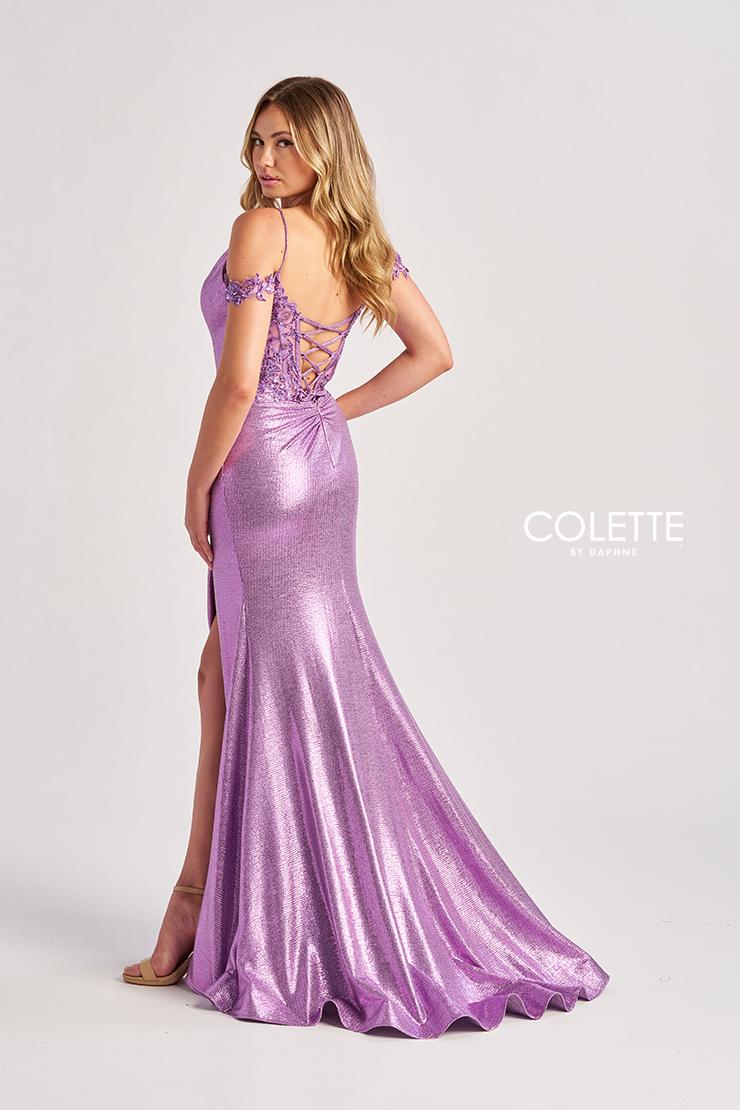 Get ready to turn heads in the Colette CL8565 dress. With stunning floral detailing and a playful off-the-shoulder cut, this dress is both elegant and eye-catching. The side slit and beautiful train add a touch of drama, making it perfect for any special occasion. Trust us, you'll be the talk of the town in this dress!