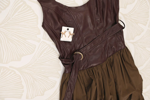 The Courtlyn Dress blends sophistication and ease with its rich brown leather top, offering a sleek, fitted silhouette complemented by a convenient zipper and tie back for a perfect custom fit. Its flowy maxi skirt adds graceful movement, making it ideal for both elegant evenings and stylish daytime outings. Elevate your wardrobe with this versatile statement piece that balances bold texture and effortless charm.