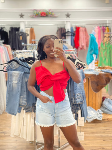 This top is perfect for your night out! The crop top is cute and comfy, with a cute little bow in front. It's super easy to wear—just zip up the back and you're good to go. This top is also great for football games, especially when you're cheering on your favorite team!