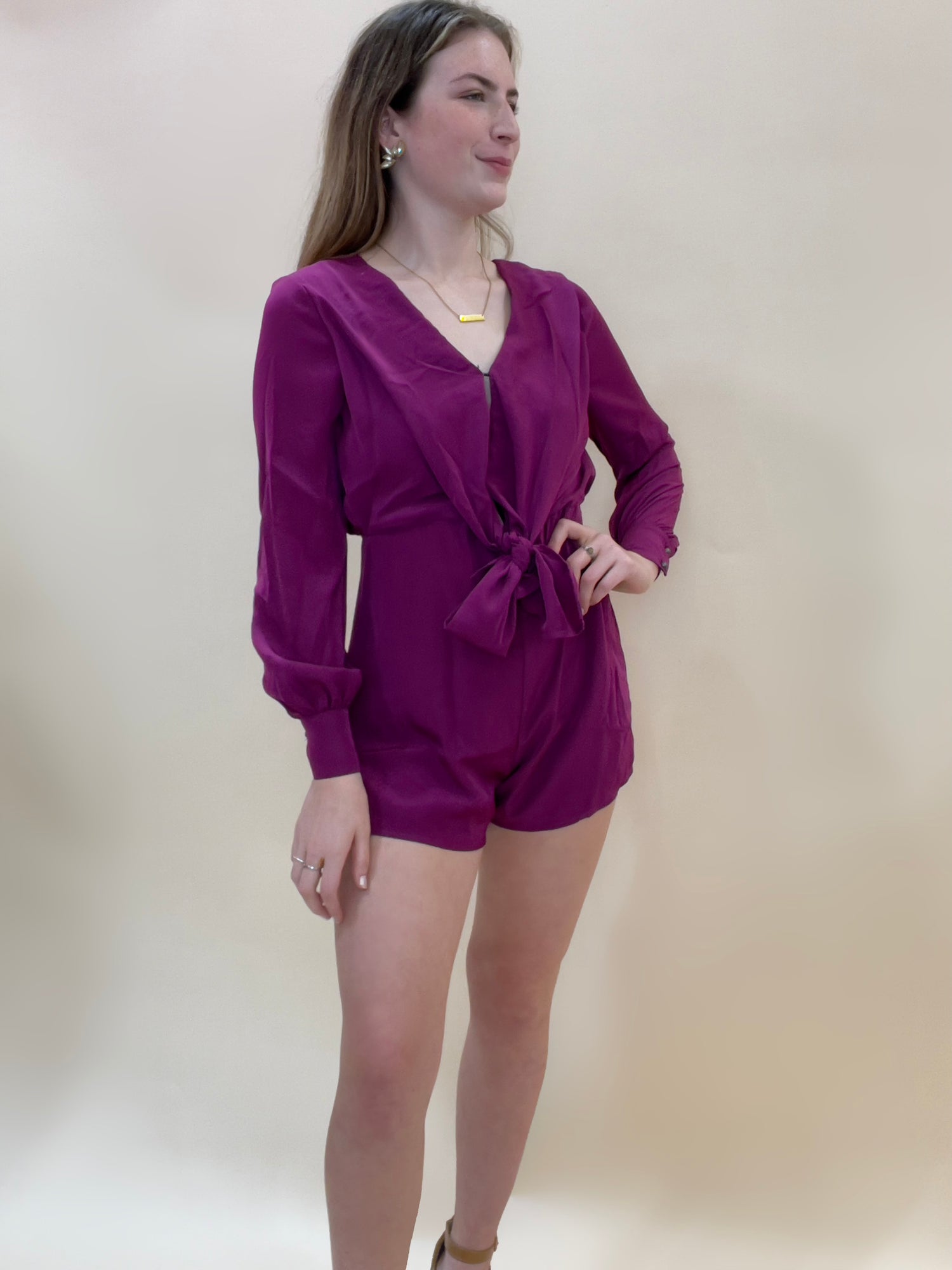 Make a statement in the Dare to Indulge Romper, a bold and flirty one-piece in a stunning purple hue that radiates confidence. This long sleeve romper features a sultry V-neckline, a playful front tie detail, and a flattering tailored fitthat hugs in all the right places.