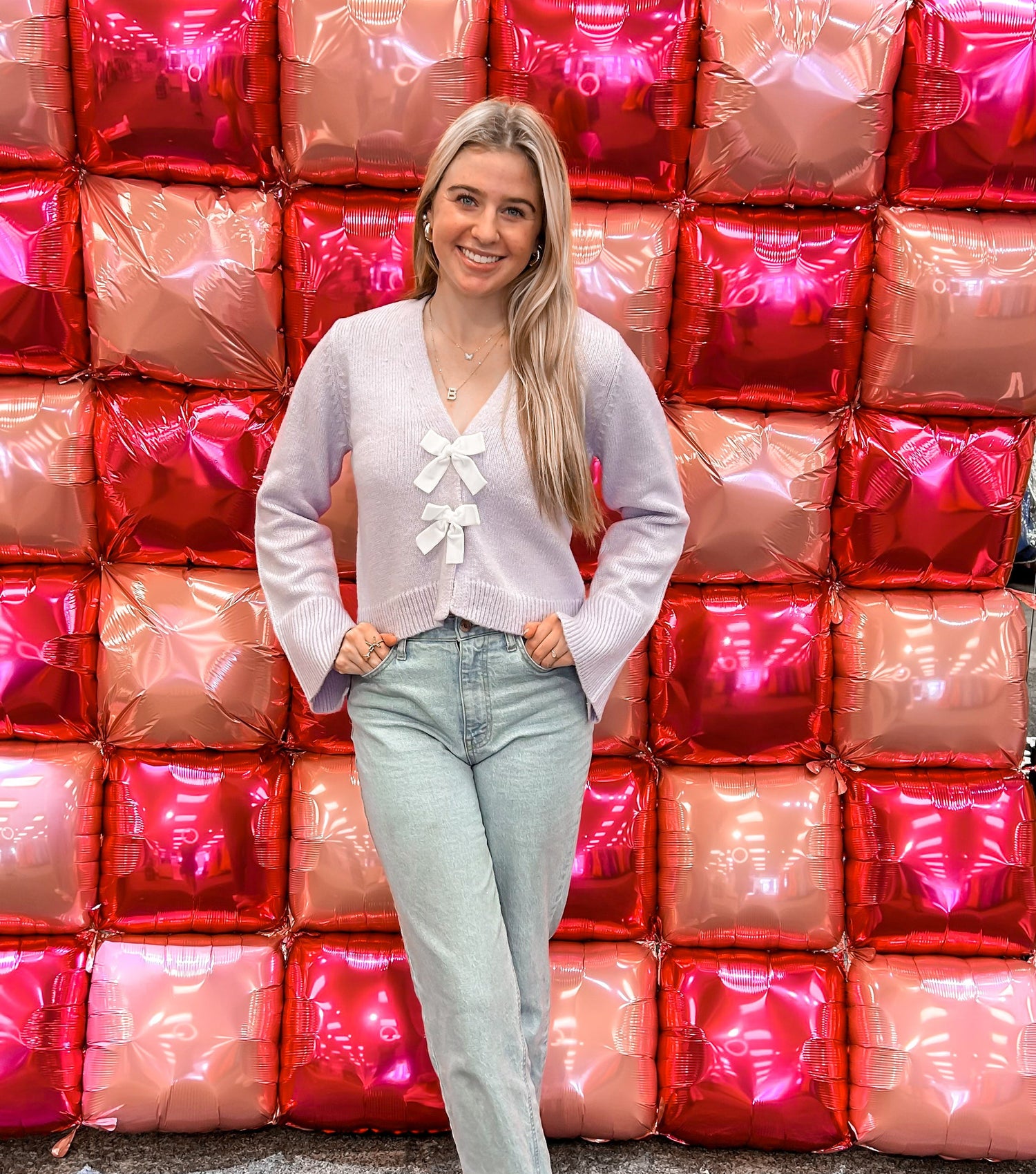 Stay cute and cozy in our Double Bow Sweater with not one, but two adorable bows. Available in both blue and lilac, this button up sweater adds a touch of charm to any outfit. Stay stylish and warm all season long.
