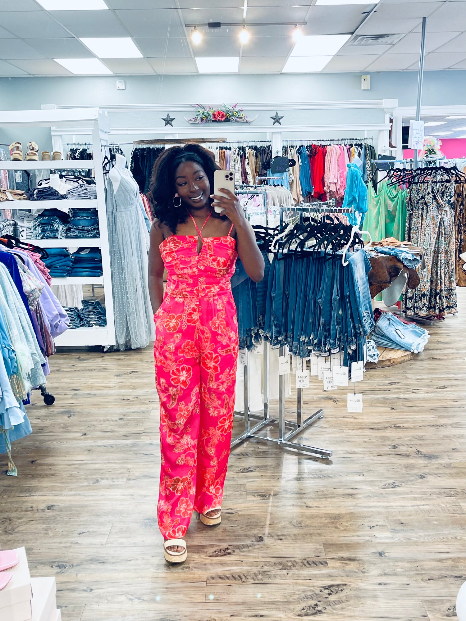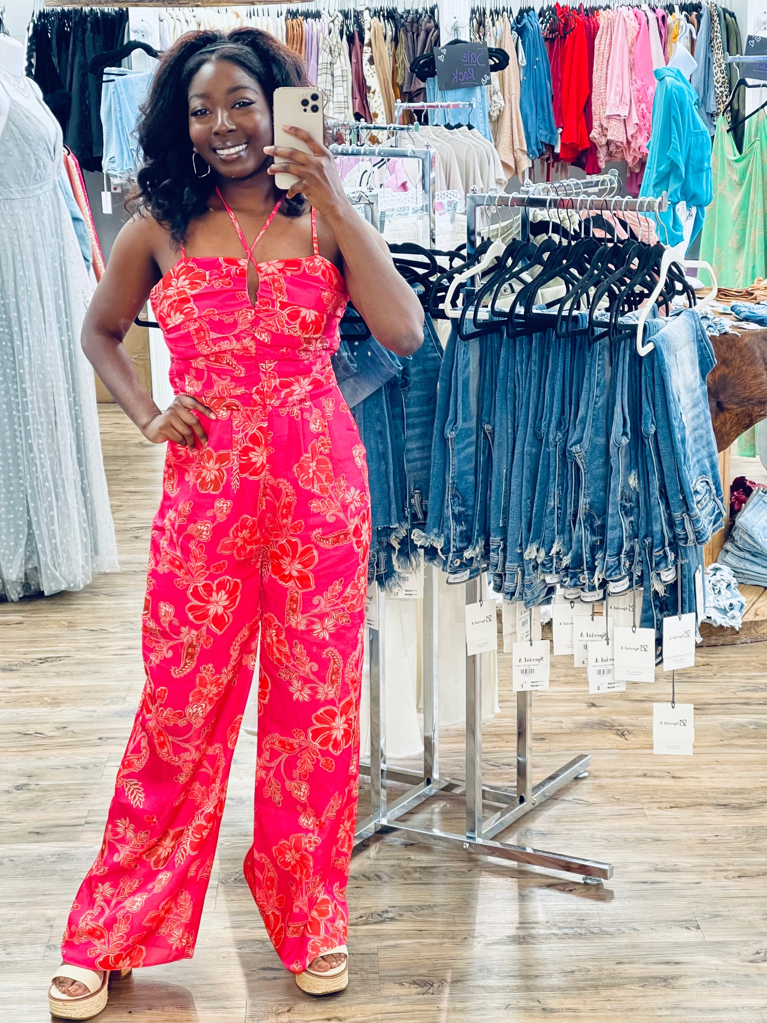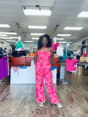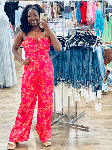 This pink jumpsuit is the perfect outfit for any occasion, whether it's a day at the beach or a night out on the town. The halter neck design will leave you feeling confident and ready to take on anything, while the floral print makes it easy to add some flare to your look.